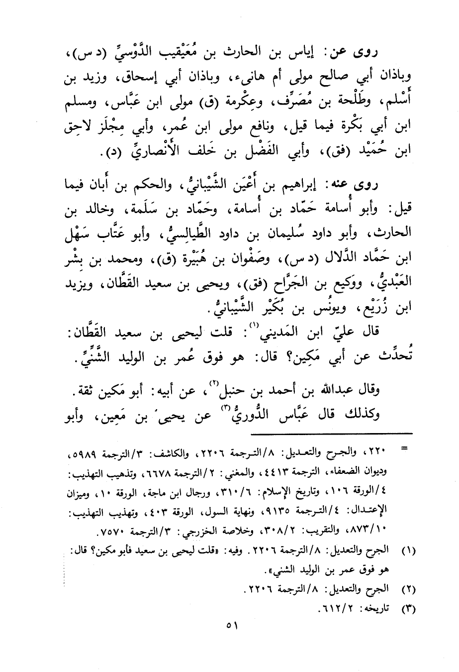 (1) الجرح والتعديل: 8 / الترجمة 2206. وفيه: قلت ليحيى بن سَعِيد فأبو مكين؟ قال: هو فوق عُمَر بن الوليد الشني.