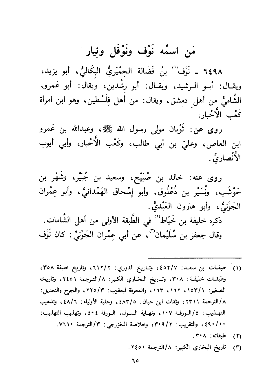 6498 - نوف بن فضالة الحميري البكالي (1) ، أَبُو يزيد، ويُقال: أَبُو الرشيد، ويُقال: أبورشدين، ويُقال: أَبُو عَمْرو، الشامي من أهل دمشق، ويُقال: من أهل فلسطين، وهو ابن امرأة كعب الأحبار.