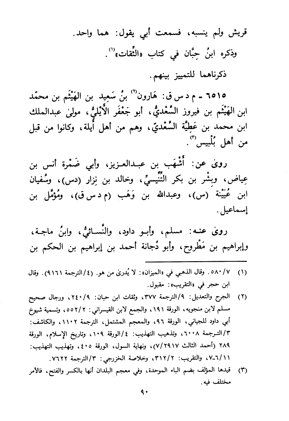 6515 - م د س ق: هارون بن سَعِيد بن الهيثم بن محمد ابن الهيثم بن فيروز السعدي (2) ، أَبُو جعفر الأيلي، مولى عَبد المَلِك ابن محمد بن عطية السعدي، وهم من أهل أيلة، وكانوا من قبل من أهل بلبيس (3) .