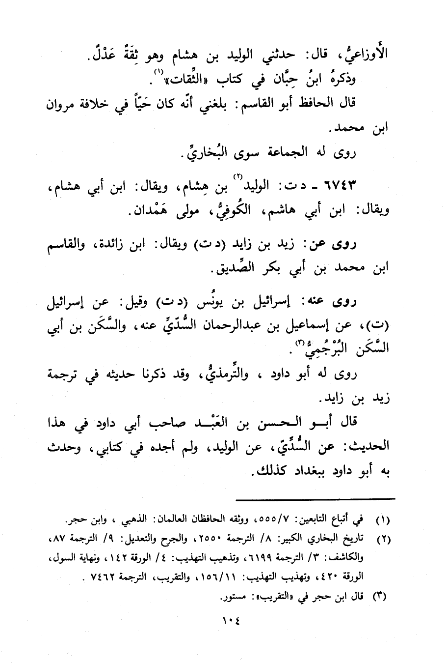 الأَوزاعِيّ، قال: حَدَّثَنِي الْوَلِيد بْن هشَام وهُوَ ثقة عدل وذكره ابنُ حِبَّان فِي كتاب "الثقات" (1) .
