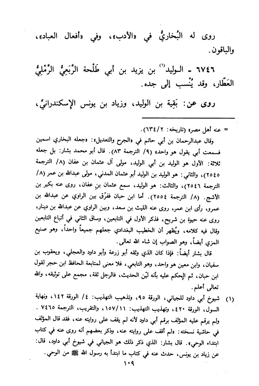 وَقَال عَبْد الرَّحْمَنِ بْن أَبي حاتم في " الجرح والتعديل": جعله البخاري اسمين فسمعت أبي يقول هو واحد" (9 / الترجمة 83) قال أبو محمد بشار: بل جعله ثلاثة: الاول هو الوليد بن أَبي الوليد، مولى آل عثمان بن عفان (8 / الترجمة 2545) ، والثاني: هو الوليد بن الوليد أبو عثمان المدني، مولى عَبد الله بن عُمَر (8 / الترجمة 2546) ، والثالث: هو الوليد، سمع عثمان بن عفان، روى عنه بكير بن الاشج (8 / الترجمة 2554) أما ابن حبان ففرق بين الراوي عن عَبد الله بن عَمْرو، رأى ابن عُمَر، روى عنه الليث بن سعد، وبين الراوي عن عَبد الله بن دينار، روى عنه حيوة بن شريح، فذكر الاول في التابعين، وساق الثاني في أتباع التابعين وَقَال فيه كلامه، ويظهر أن الخطيب البغدادي جعلهم جميعا واحدًا، وهو صنيع المزي أيضا، وهو الصواب إن شاء الله تعالى.