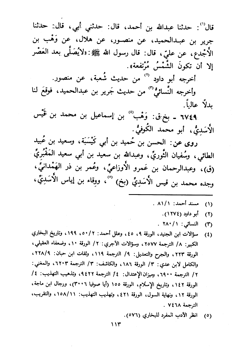 قال (1) : حَدَّثَنَا عَبد اللَّهِ بْن أَحْمَدَ، قال: حَدَّثني أبي، قال: حَدَّثَنَا جرير بن عبد الحميد، عَنْ منصور، عَنْ هلال، عَنْ وهْبِ بْنِ الأَجْدَعِ، عَنْ عَلِيٍّ، قال: قال رَسُولُ اللَّهِ صلى الله عليه وسلم: لا يُصَلِّي بَعْدَ الْعَصْرِ إِلا أَنْ تَكُونَ الشَّمْسُ مُرْتَفِعَةً.