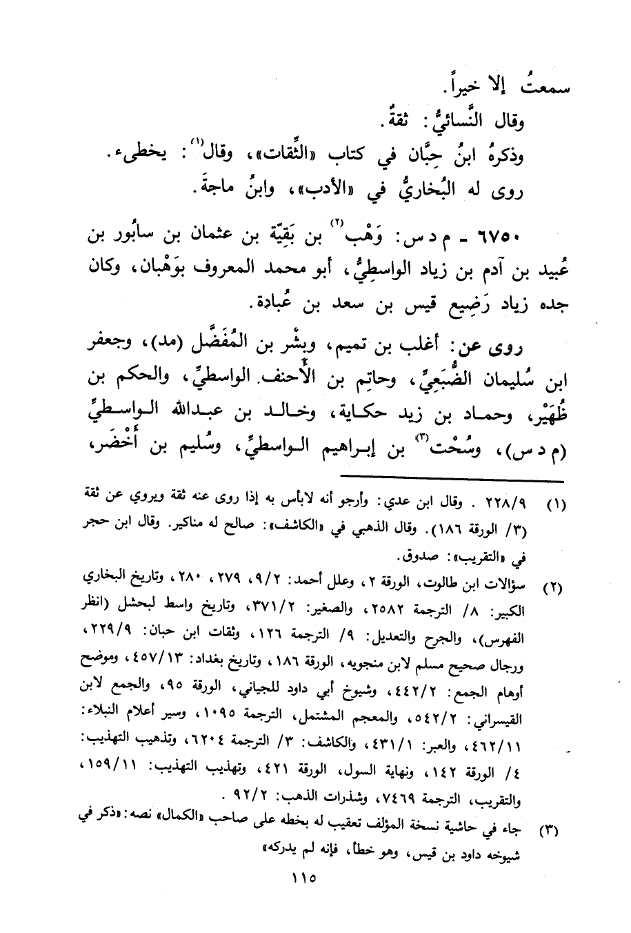 6750 - م د س: وهْب، بن بقية بن عُثْمَان بن سابور بن عُبَيد بن آدم بن زياد الواسطي (2) ، وأبو مُحَمَّد المعروف بوهبان، وكَانَ جده زياد رضيع قيس بْن سَعْد بْن عبادة.