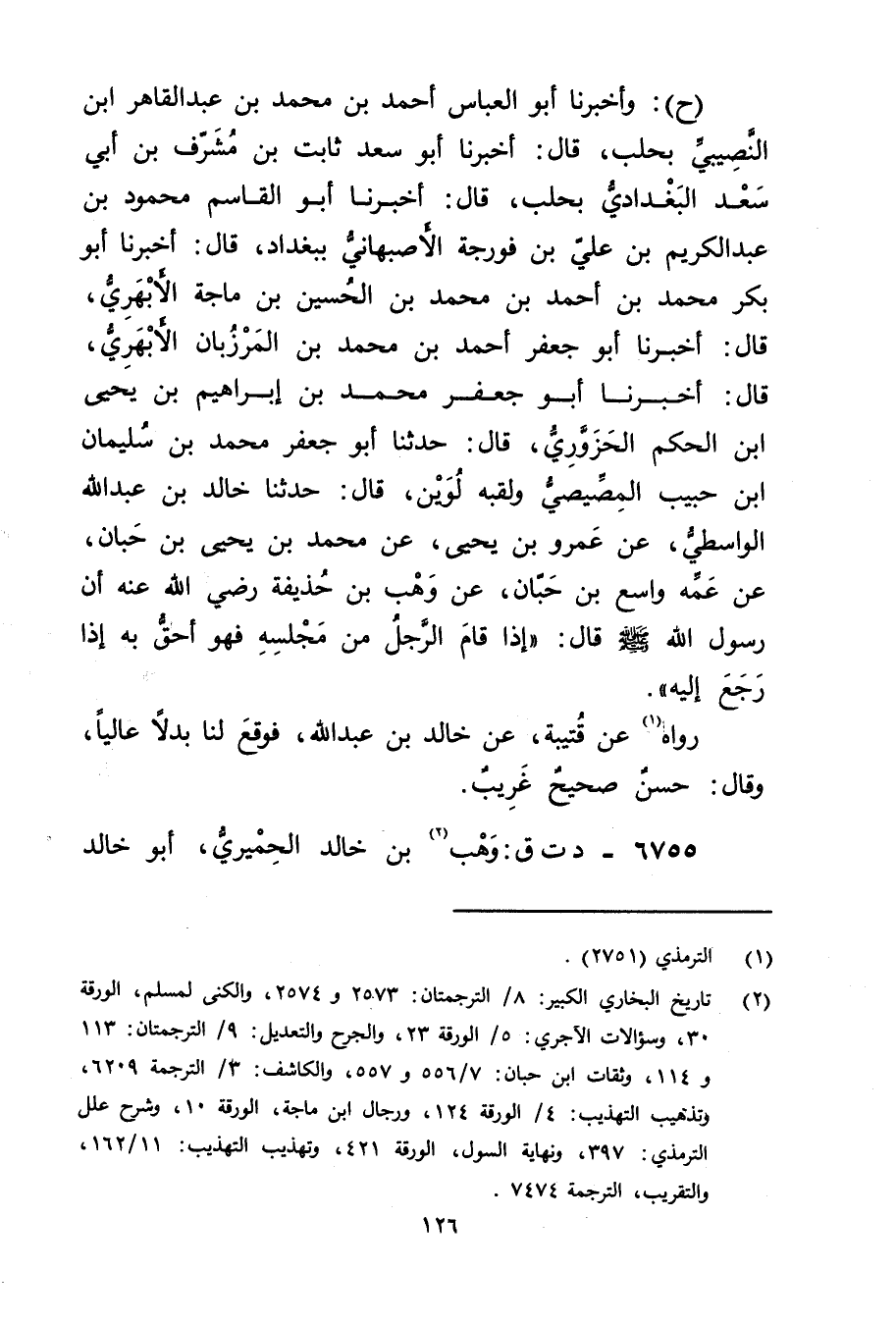 (ح) : وأَخْبَرَنَا أَبُو الْعَبَّاسِ أَحْمَدُ بن محمد بن عبد القاهر ابن النَّصِيبِيِّ بِحَلَبَ، قال: أخبرنا أبو سَعْدٍ ثَابِتُ بْنُ مُشَرِّفِ بْنِ أَبي سعد البغدادي بحلب، قال: أخبرنا أَبُو الْقَاسِمِ مَحْمُودُ بْنُ عَبْدِ الْكَرِيمِ بْنِ عَلِيِّ بْنِ فُورَجَةَ الأَصْبَهَانِيُّ بِبَغْدَادَ، قال: أخبرنا أَبُو بَكْر مُحَمَّد بْن أَحْمَد بْن مُحَمَّدِ بْنِ الحسين بْن مَاجَهْ الأَبْهَرِيُّ، قال: أخبرنا أَبُو جَعْفَر أَحْمَد بْن مُحَمَّد بْن الْمَرْزُبَانِ الأَبْهَرِيُّ، قال: أخبرنا أَبُو جعفر مُحَمَّد بْن إِبْرَاهِيم بْن يحيى ابن الْحَكَمِ الْحَزَوَّرِيُّ، قال: حَدَّثَنَا أَبُو جعفر محمد بن سُلَيْمان ابن حَبِيبٍ الْمِصِّيصِيُّ ولَقَبُهُ لُوَيْنٌ، قال: حَدَّثَنَا خالد بْن عَبد اللَّهِ الْوَاسِطِيُّ، عَنْ عَمْرو بْنِ يَحْيَى، عَنْ مُحمد بْن يَحيى بْن حَبَّان، عن عمه واسع بن حَبَّانَ، عَنْ وهْبِ بْنِ حُذَيْفَةَ رضي الله عَنْهُ أَنَّ رَسُولَ اللَّهِ صلى اللَّهُ عَلَيْه وسَلَّمَ قال: إِذَا قَامَ الرَّجُلُ مِنْ مَجْلِسِهِ فَهُوَ أَحَقُّ بِهِ إِذَا رَجَعَ إِلَيْهِ.