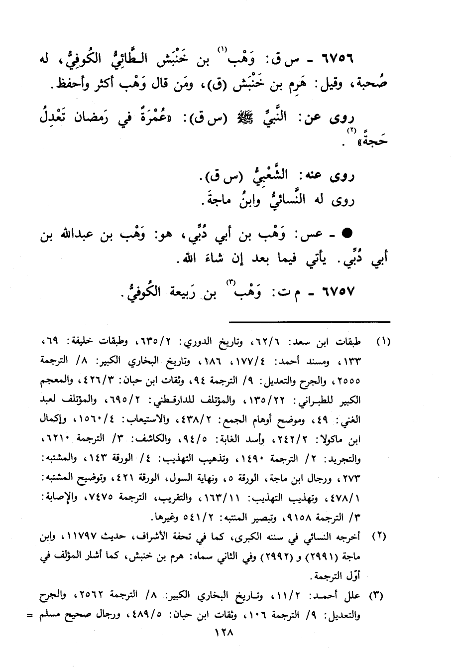6756 - س ق: وهْب بن خنبش الطائي الكوفي (1) ، لهُ صُحبَةٌ، وقيل: هرم بْن خنبش (ق) ، ومن قال وهْب أكثر وأحفظ.