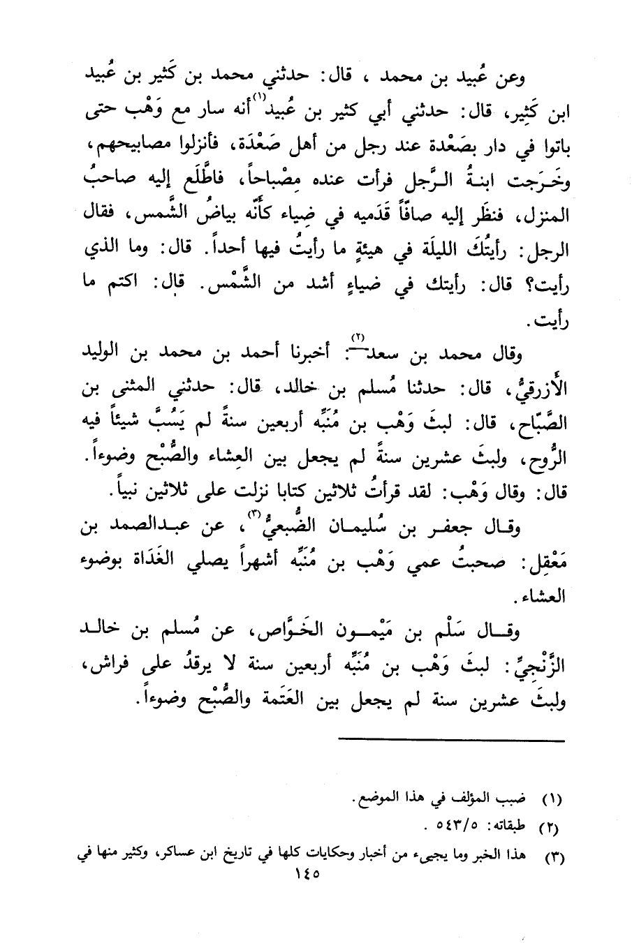 وَقَال مُحَمَّد بْن سَعْد (2) : أخبرنا أَحْمَد بْن مُحَمَّد بْن الْوَلِيد الأزرقي، قال: حَدَّثَنَا مسلم بْن خَالِد، قال: حَدَّثَنِي المثنى بْن الصباح، قال: لبث وهْب بْن منبه أربعين سنة لم يسب شيئا فيه الروح، ولبث عشرين سنة لم يجعل بين العشاء والصبح وضوءا. قال: وَقَال وهْب: لقد قرأت ثلاثين كتابا نزلت على ثلاثين نبيا.