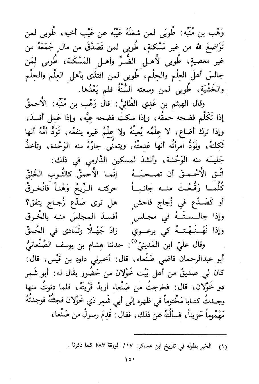 وَقَال الْهَيْثَم بْن عدي الطائي: قال وهْب بْن منبه: الأحمق إذا تكلم فضحه حمقه، وإذا سكت فضحه عيه، وإذا عمل أفسد. وإذا ترك أضاع، لا علمه يعينه ولا علم غيره ينفعه، تود أمه أنها ثكلته، وتود امرأته أنها عدمته، ويتمنى جاره منه الوحدة، وتأخذ جليسه منه الوحشة، وأنشد لمسكين الدارمي فِي ذَلِكَ: