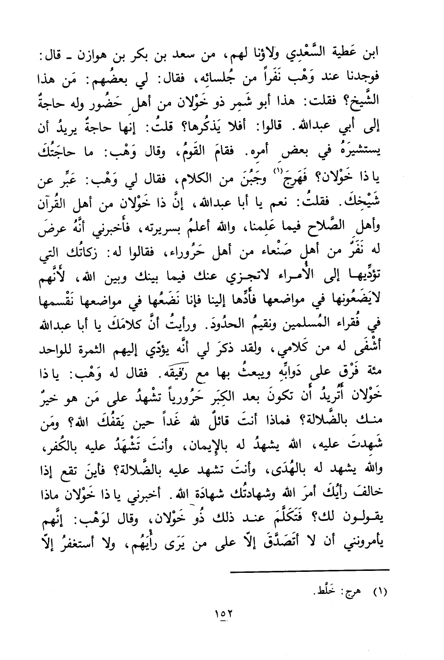 ابن عطية السعدي ولاؤنا لهم، من سعد بن بكر بن هوازن، قال فوجدنا عند وهْب نفرا من جلسائه، فَقَالَ: لي بعضهم: من هذا الشيخ؟ فقلت: هذا أَبُو شمر ذو خولان من أهل حضور وله حاجة إلى أَبِي عَبد اللَّهِ. قَالُوا: أفلا يذكرها؟ قلت: إنها حاجة يريد أن يستشيره فِي بعض أمره. فقام القوم، وَقَال وهْب: مَا حاجتك يا ذا خولان؟ فهرج (1) وجبن من الكلام، فَقَالَ لي وهْب: عبر عَنْ شيخك. فقلت: نعم يا أَبَا عَبْد اللَّهِ، إن ذا خولان من أهل القرآن وأهل الصلاح فيما علمنا، والله أعلم بسريرته، فأخبرني أنه عرض له نفر من أهل صنعاء من أهل حروراء، فقالوا له: زكاتك التي تؤديها إلى الأمراء لا تجزي عنك فيما بينك وبين الله، لأنهم لا يضعونها فِي مواضعها فأدها إلينا فإنا نضعها فِي مواضعها نقسمها فِي فقراء المسلمين ونقيم الحدود. ورأيت أن كلامك يا أَبَا عَبد اللَّهِ أشفى له من كلامي، ولقد ذكر لي أنه يؤدي إليهم الثمرة للواحد مئة فرق على دوابه ويبعث بها مع رفيقه. فَقَالَ له وهْب: يا ذا خولان أتريد أن تكون بعد الكبر حروريا تشهد على من هُوَ خير منك بالضلالة؟ فماذا أنت قائل لله غدا حين يقفك الله؟ ومن شهدت عليه، الله يشهد له بالإيمان، وأنت تشهد عليه بالكفر، والله يشهد له بالهدى، وأنت تشهد عليه بالضلالة؟ فأين تقع إذا خالف رأيك أمر الله وشهادتك شهادة الله. أخبرني يا ذا خولان ماذا يقولون لك؟ فتكلم عند ذَلِكَ ذو خولان، وَقَال لوهب: إنهم يأمرونني أن لا أتصدق إلا على من يرى رأيهم، ولا أستغفر إلا
