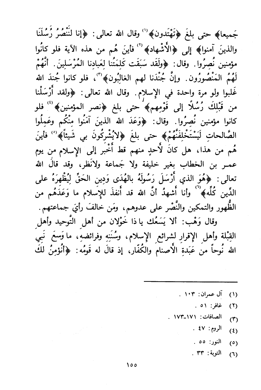 جميعا) حَتَّى بلغ (تهتدون) (1) وَقَال الله تعالى: (إنا لننصر رسلنا والذين آمنوا) إلى (الأشهاد) (2) فأين هم من هذه الآية فلو كانوا مؤمنين نصروا. وَقَال (ولقد سبقت كلمتنا لعبادنا المرسلين. أنهم لهم المنصورون. وإن جندنا لهم الغالبون) (3) ، فلو كانوا جند الله غلبوا ولو مرة واحدة فِي الإسلام. وَقَال الله تعالى (ولقد أرسلنا من قبلك رسلا إلى قومهم) حَتَّى بلغ (نصر المؤمنين) (4) فلو كانوا مؤمنين نصروا. وَقَال: (وعد الله الذين آمنوا منكم وعملوا الصالحات ليستخلفنهم) حَتَّى بلغ (لا يشركون بي شيئا) (5) فأين هم من هذا، هل كَانَ لأحد منهم قط أخبر إلى الإسلام من يوم عُمَر بْن الخطاب بغير خليفة ولا جماعة ولا نظر، وقد قال الله تعالى: (هُوَ الذي أرسل رسوله بالهدى ودين الحق ليظهره على الدين كله) (6) وأنا أشهد أن الله قد أنفذ للإسلام مَا وعدهم من الظهور والتمكين والنصر على عدوهم، ومن خالف رأي جماعتهم.