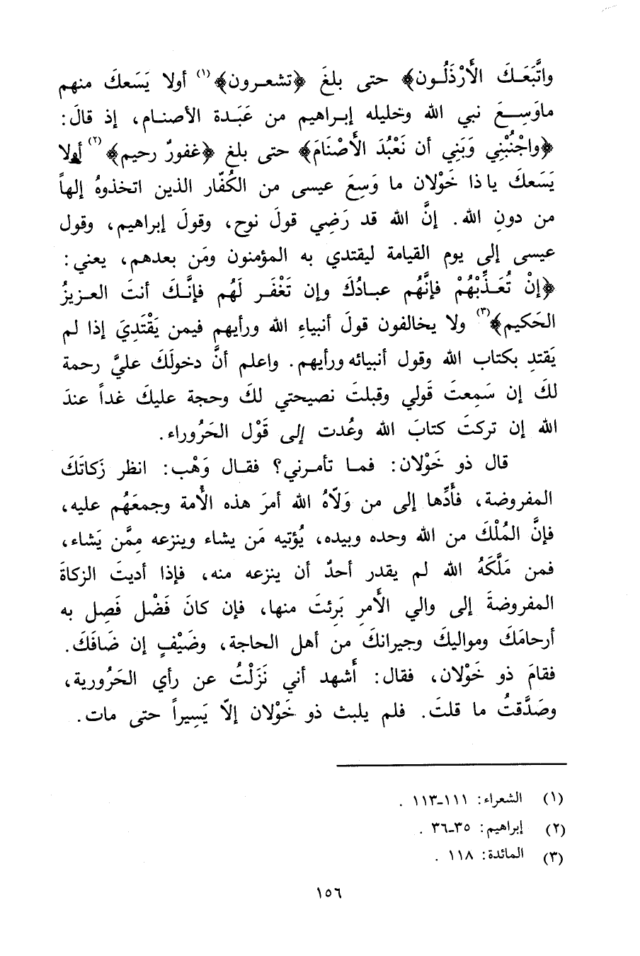 واتبعك الأرذلون) حَتَّى بلغ (تشعرون) (1) أولا يسعك منهم مَا وسع نبي الله وخليله إِبْرَاهِيم من عَبْدَة الأصنام، إذ قال: (واجنبني وبني أن نعبد الأصنام) حَتَّى بلغ (غفور رحيم) (2) أولا يسعك يا ذا خولان مَا وسع عِيسَى من الكفار الذين اتخذوه إلها من دون الله. إن الله قد رضي قول نوح، وقول إِبْرَاهِيم، وقول عِيسَى إلى يوم القيامة ليقتدي بِهِ المؤمنون ومن بعدهم، يَعْنِي: (إن تعذبهم فَإِنَّهُمْ عِبَادُكَ وَإِنْ تَغْفِرْ لَهُمْ فإنك أنت العزيز الحكيم) (3) ولا يخالفون قول أنبياء الله ورأيهم فيمن يقتدي إذا لم يقتد بكتاب الله وقول أنبيائه ورأيهم، واعلم أن دخولك علي رحمة لك إن سمعت قولي وقبلت نصيحتي لك وحجة عليك غدا عند الله إن تركت كتاب الله وعدت إلى قول الحر وراء.