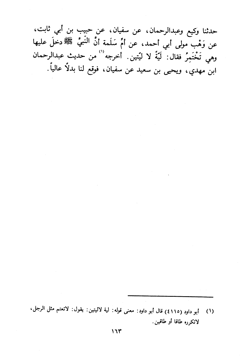 حَدَّثَنَا وكِيعٌ وعَبْدُ الرَّحْمَنِ، عَنْ سُفْيَانَ، عَنْ حَبِيبِ بْنِ أَبي ثَابِتٍ، عَنْ وهْبٍ مَوْلَى أَبِي أَحْمَدَ، عَنْ أُمِّ سَلَمَةَ أَنَّ النَّبِيُّ صلى الله عليه وسلم دَخَلَ عَلَيْهَا وهِيَ تَخْتَمِرُ فَقَالَ: لَيَّةً لا لَيَّتَيْنِ. أخرجه (1) من حديث عبد الرحمن ابن مَهْدِيّ، ويحيى بْن سَعِيد عَنْ سُفْيَان، فوقع لنا بدلا عاليا.