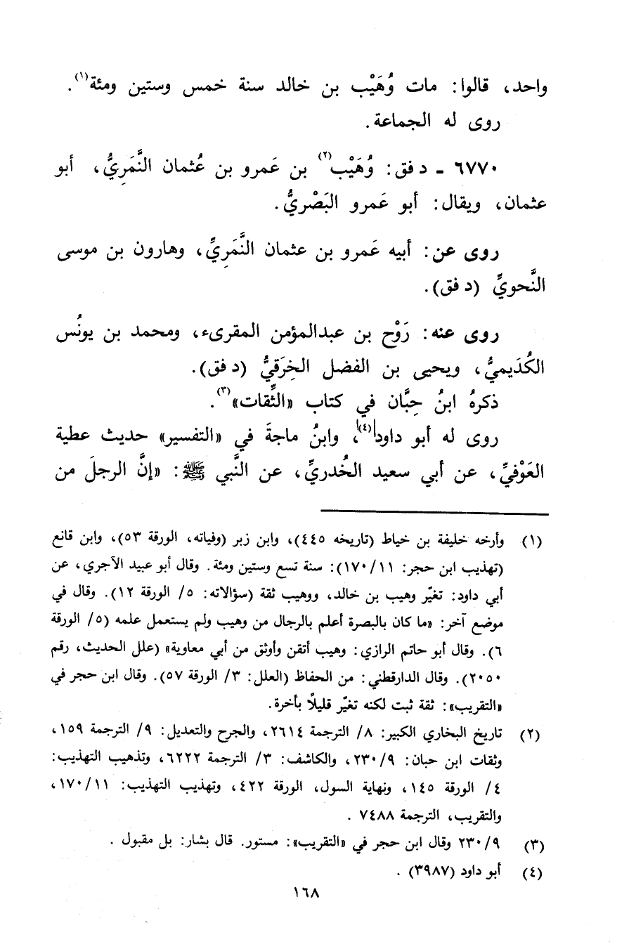 (1) وأرخه خليفة بن خياط (تاريخه 445) ، وابن زبر (وفياته، الورقة 53) ، وابن قانع (تهذيب ابن حجر: 11 / 170) : سنة تسع وستين ومئة. وَقَال أَبُو عُبَيد الآجري، عَن أبي داود: تغير وهيب بن خالد، ووهيب ثقة (سؤالاته: 5 / الورقة 12) وَقَال فِي موضع آخر: ما كان بالبصرة أعلم بالرجال من وهيب ولم يستعمل علمه (5 / الورقة 6) وَقَال أبو حاتم الرازي: وهيب أتقن وأوثق من أبي معاوية" (علل الحديث، رقم 2050) وَقَال الدَّارَقُطْنِيُّ: من الحفاظ (العلل: 3 / الورقة 57) وَقَال ابن حجر في "التقريب": ثقة ثبت لكنه تغير قليلا بأخره.