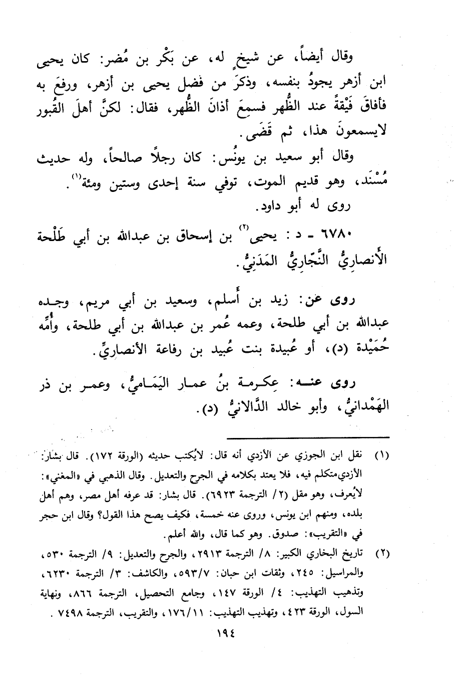 (1) نقل ابن الجوزي عن الأزدي أنه قال: لا يكتب حديثه (الورقة 172) . قال بشار: الأزدي متكلم فيه، فلا يعتد بكلامه في الجرح والتعديل. وَقَال الذهبي في " المغني": لا يعرف، وهو مقل (2 / الترجمة 6923) قال بشار: قد عرفه أهل مصر، وهم أهل بلده، ومنهم ابن يونس، وروى عنه خمسة، فكيف يصح هذا القول؟ وَقَال ابن حجر في "التقريب": صدوق. وهو كما قال، والله أعلم.