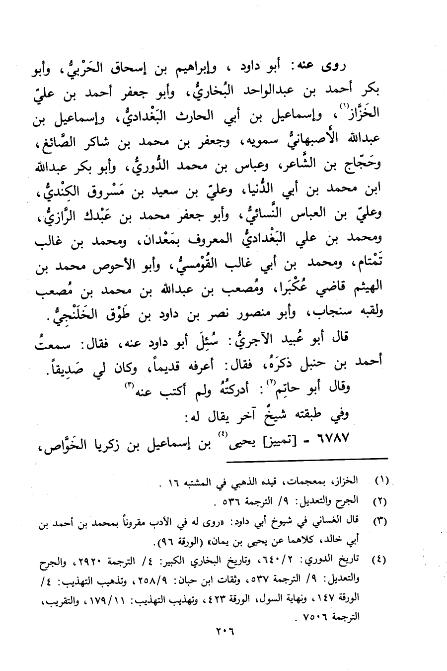 (3) قال الغساني فِي شيوخ أبي داود: روى له في الادب مقرونا بمحمد بْن أَحْمَد بْن أَبي خالد، كلاهما عن يحيى بن يمان" (الورقة 96) (4) تاريخ الدوري: 2 / 640، وتاريخ البخاري الكبير: 4 / الترجمة 2920، والجرح والتعديل: 9 / الترجمة 537، وثقات ابن حبان: 9 / 258، وتذهيب التهذيب: 4 / الورقة 147، ونهاية السول الورقة 423، وتهذيب التهذيب: 11 / 179، والتقريب الترجمة 7506