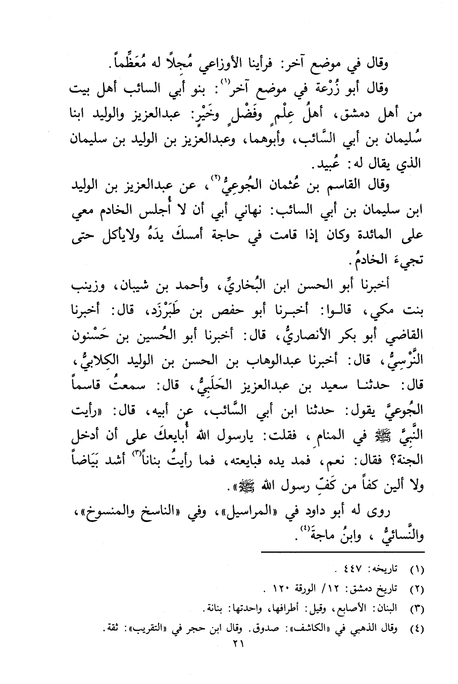 أخبرنا أَبُو الْحَسَن بْن الْبُخَارِيِّ، وأحمد بْن شَيْبَانَ، وزينب بِنْتُ مَكِّيٍّ، قَالُوا: أَخْبَرَنَا أَبُو حفص بن طَبَرْزَذَ، قال: أخبرنا الْقَاضِي أَبُو بَكْرٍ الأَنْصارِيّ، قال: أخبرنا أَبُو الحسين بن حسنون النرسي، قال: أَخْبَرَنَا عَبْدُ الْوَهَّابِ بْنُ الْحَسَنِ بْنِ الْوَلِيد الكِلابي، قال: حَدَّثَنَا سَعِيد بْن عَبْد الْعَزِيزِ الحلبي، قال: سمعت قاسما الجوعي يَقُول: حَدَّثَنَا ابْن أَبي السائب، عَن أَبِيهِ، قال: رَأَيْتُ النَّبِيَّ صَلَّى اللَّهُ عليه وسلم فِي المنام، فقلت: يارسول اللَّهِ أبايعك على أن أدخل الجنة؟ فَقَالَ: نعم، فمد يده فبايعه، فما رأيت بنانا (3) أشد بياضا ولا ألين كفا من كف رَسُول اللَّهِ صلى الله عليه وسَلَّمَ.