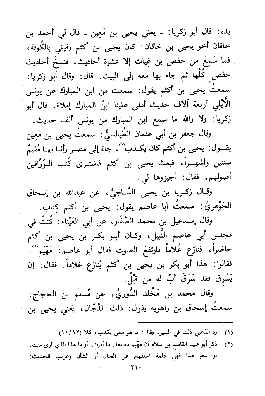 يده: قال أَبُو زكريا:، يعني يَحْيَى بْن مَعِين، قال لي أَحْمَد بْن خاقان أخو يَحْيَى بْن خاقان: كَانَ يَحْيَى بْن أكثم رفيقي بالكوفة , فما سمع من حَفْص بْن غياث إلا عشرة أحاديث، فنسخ أحاديث حَفْص كلها ثُمَّ جاء بها معه إلى البيت: قال: وَقَال أَبُو زكريا: سمعت يَحْيَى بْن أكثم يَقُول: سمعت من ابْن الْمُبَارَك عَنْ يُونُس الأيلي أربعة آلاف حديث أملى علينا ابْن الْمُبَارَك إملاء. قال أَبُو زكريا: ولا والله مَا سمع ابْن الْمُبَارَك من يُونُس ألف حديث.