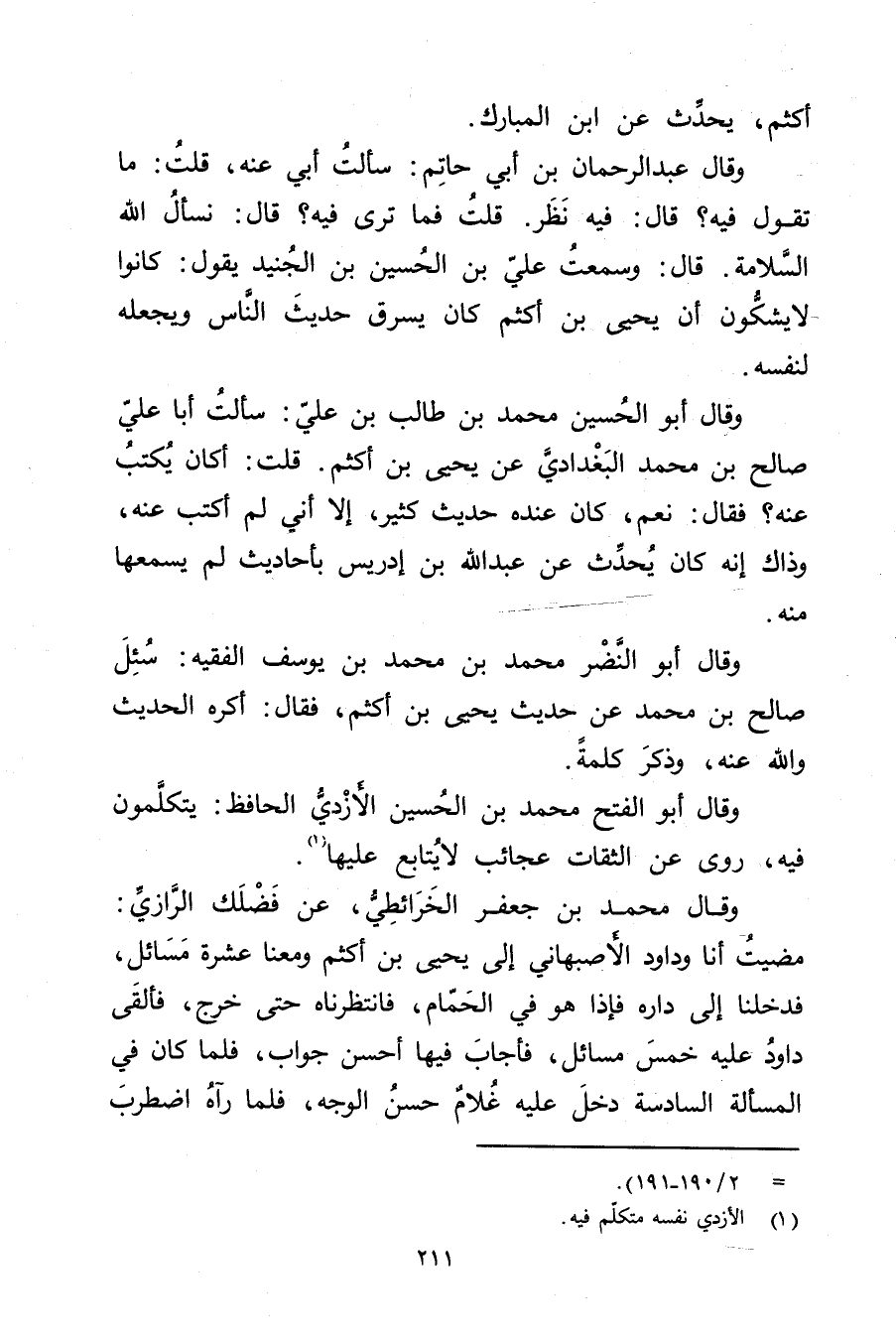 وَقَال أَبُو النضر مُحَمَّد بْن مُحَمَّد بْن يوسف الفقيه: سئل صَالِح بْن مُحَمَّد عَنْ حديث يَحْيَى بْن أكثم، فَقَالَ: أكره الحديث والله عنه، وذكر كلمة.