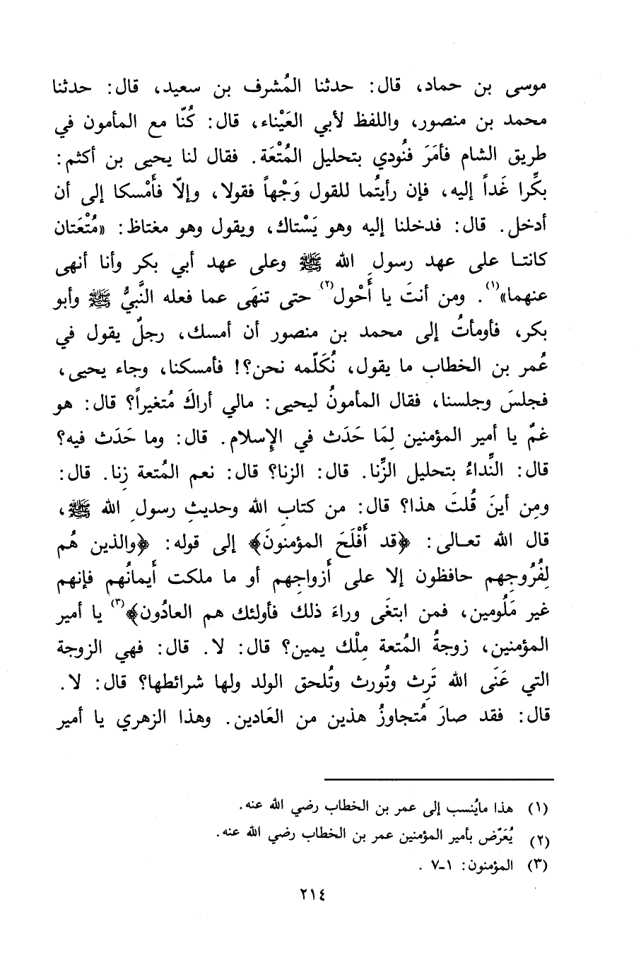 مُوسَى بْن حَمَّاد، قال: حَدَّثَنَا المشرف بْن سَعِيد، قال: حَدَّثَنَا مُحَمَّد بْن مَنْصُور، واللفظ لأبي العيناء، قال: كنا مع الْمَأْمُون فِي طريق الشام فأمر فنودي بتحليل المتعة. فَقَالَ لنا يَحْيَى بْن أكثم: بكرا غدا إليه، فإن رأيتما للقول وجها فقولا، وإلا فأمسكا إلى أن أدخل. قال: فدخلنا إليه وهُوَ يستاك، ويقول وهُوَ مغتاظ: متعتان كانتا عَلَى عَهْدِ رَسُولِ اللَّهِ صَلَّى الله عليه وسلم وعلى عهد أَبِي بَكْر وأنا أنهى عنهما" (1) . ومن أنت يا أحول (2) حَتَّى تنهى عما فعله النَّبِيّ صلى الله عليه وسلم وأَبُو بَكْرٍ، فأومأت إلى مُحَمَّد بْن مَنْصُور أن أمسك، رجل يَقُول فِي عُمَر بْن الخطاب مَا يَقُول، نكلمه نحن؟ ! فأمسكنا، وجاء يَحْيَى، فجلس وجلسنا، فَقَالَ الْمَأْمُون ليحيى: مالي أراك متغيرا؟ قال: هُوَ غم يا أمير المؤمنين لما حدث فِي الإسلام.