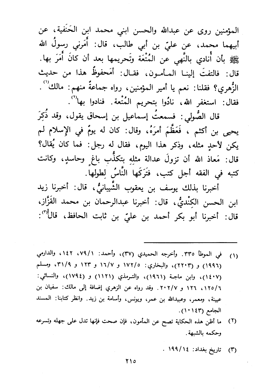 المؤمنين روى عن عَبد اللَّهِ والحسن بني محمد ابن الْحَنَفِيَّةِ، عَنْ أَبِيهِمَا مُحَمَّدٍ، عَنْ عَلِيّ بْن أَبي طالب، قال: أَمَرَنِي رَسُولُ اللَّهِ صَلَّى اللَّهُ عليه وسلم بِأَنْ أُنَادِي بِالنَّهْيِ عَنِ الْمُتْعَةِ وتَحْرِيمِهَا بَعْدَ أَنْ كَانَ أَمَرَ بِهَا. قال: فَالْتَفَتَ إِلَيْنَا الْمَأْمُونُ، فَقَالَ: أَمَحْفُوظٌ هَذَا مِنْ حَدِيثِ الزُّهْرِيّ؟ فَقُلْنَا: نَعَمْ يَا أَمِيرَ الْمُؤْمِنِينَ، رواه جماعة منهم: مَالِك (1) ، فَقَالَ: استغفر الله، نادوا بتحريم المتعة، فنادوا بها (2) .