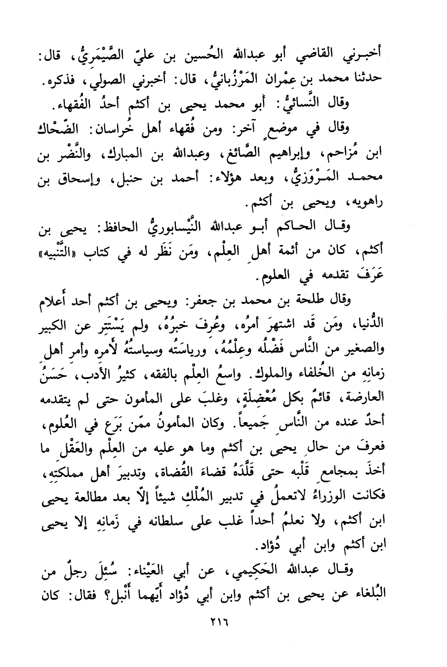 وَقَال الحاكم أَبُو عَبْد اللَّهِ النيسابوري الْحَافِظ: يَحْيَى بْن أكثم، كَانَ من أئمة أهل العلم، ومن نظر له فِي كتاب" التنبيه" عرف تقدمه فِي العلوم.