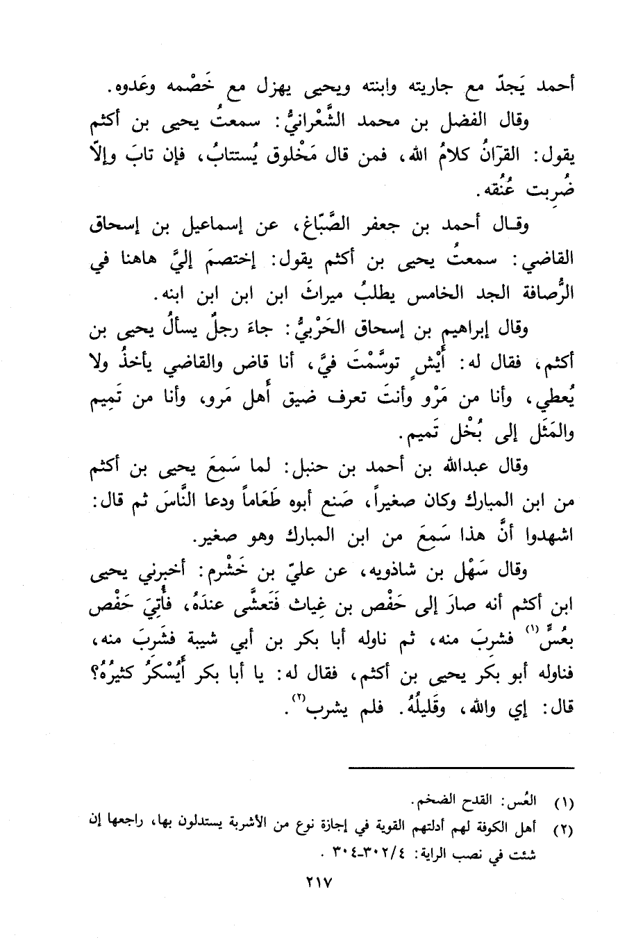 وَقَال سهل بْن شاذويه، عَنْ علي بْن خشرم: أخبرني يَحْيَى ابن أكثم، أنه صار إلى حَفْص بْن غياث فتعشى عنده، فأتي حَفْص بعس (1) ، فشرب منه، ثُمَّ ناوله أَبَا بَكْر بْن أَبي شَيْبَة فشرب منه، فناوله أَبُو بَكْر يَحْيَى بْن أكثم، فَقَالَ له: يا أَبَا بَكْر أيسكر كثيره؟ قال: إي والله، وقليله. فلم يشرب (2)