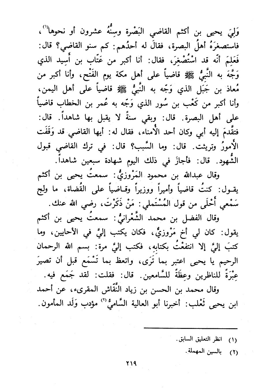 ولي يَحْيَى بْن أكثم الْقَاضِي البصرة وسنه عشرون أو نحوها (1) ، فاستصغره أهل البصرة، فَقَالَ له أحدهم: كم سنو الْقَاضِي؟ قال: فعلم أنه قد استصغر، فَقَالَ: أنا أكبر من عتاب بْن أسيد الذي وجه بِهِ النَّبِيّ صلى الله عليه وسلم قاضيا على أهل مكة يوم الفتح، وأنا أكبر من مُعَاذ بْن جبل الذي وجه بِهِ النَّبِيّ صلى الله عليه وسلم قاضيا على أهل الْيَمَن، وأنا أكبر من كعب بْن سور الذي وجه بِهِ عُمَر بْن الخطاب قاضيا على أهل البصرة. قال: وبقي سنة لا يقبل بها شاهدا. قال: فتقدم إليه أَبِي وكَانَ أحد الأمناء، فَقَالَ له: أيها الْقَاضِي قد وقفت الأمور وتريثت. قال: وما السبب؟ قال: فِي ترك الْقَاضِي قبول الشهود. قال: فأجاز فِي ذَلِكَ اليوم شهادة سبعين شاهدا.