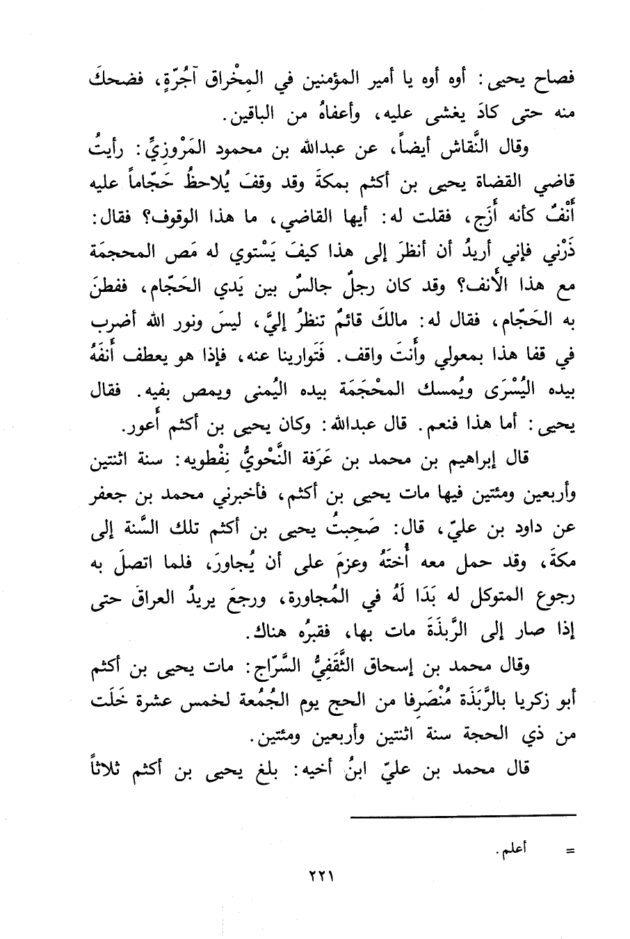 وَقَال النقاش أيضا، عَنْ عَبد اللَّهِ بْن مَحْمُود الْمَرْوَزِيّ: رأيت قاضي القضاة يَحْيَى بْن أكثم بمكة وقد وقف يلاحظ حجاما عليه أنف كأنه أزج، فقلت له: أيها الْقَاضِي، مَا هذا الوقوف؟ فَقَالَ: ذرني فإني أريد أن أنظر إلى هذا كيف يستوي له مص المحجمة مع هذا الأنف؟ وقد كَانَ رجل جالس بين يدي الحجام، ففطن بِهِ الحجام، فَقَالَ له: مَالِك قائم تنظر إلي، ليس ونور الله أضرب فِي قفا هذا بمعولي وأنت واقف. فتوارينا عنه، فإذا هُوَ يعطف أنفه بيده اليسرى ويمسك المحجمة بيده اليمنى ويمص بفيه، فَقَالَ يَحْيَى: أما هذا فنعم. قال عَبد اللَّهِ: وكَانَ يَحْيَى بْن أكثم أعور.