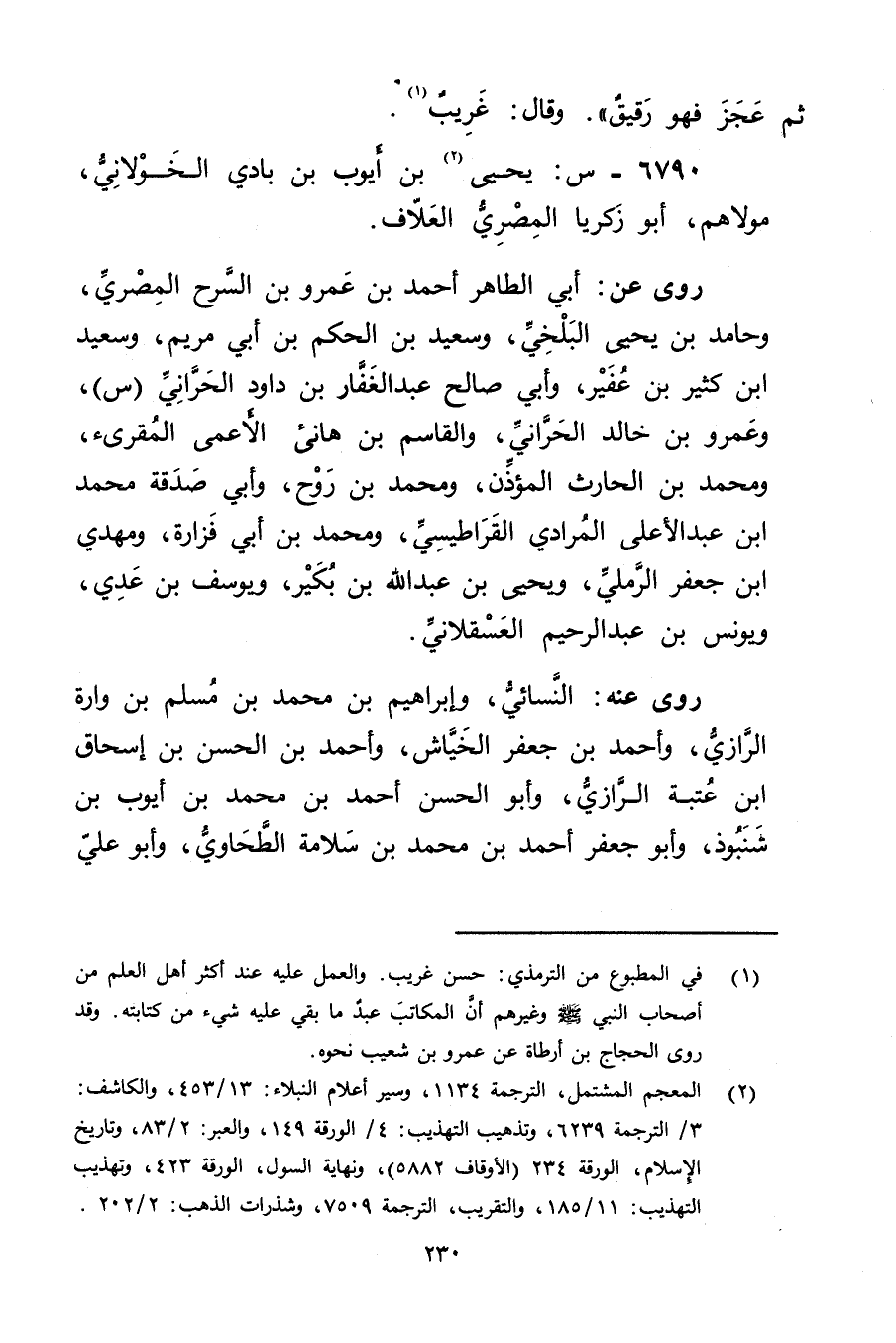 (2) المعجم المشتمل، الترجمة 1134، وسير أعلام النبلاء: 13 / 453، والكاشف: 3 / الترجمة 6239، وتذهيب التهذيب: 4 / الورقة 149، والعبر: 2 / 83، وتاريخ الاسلام، الورقة 234 (الاوقاف 5882) ، ونهاية السول، الورقة 423، وتهذيب التهذيب: 11 / 185، والتقريب، الترجمة 7509، وشذرات الذهب: 2 / 202