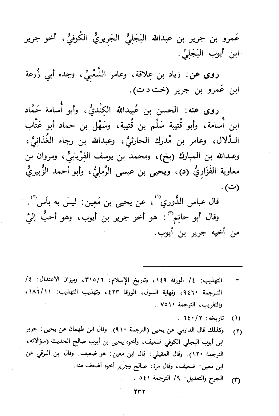 (2) وكذلك قال الدارمي عن يحيى (الترجمة 910) . وَقَال ابن طهمان عن يحيى: جرير ابن أيوب البجلي الكوفي ضعيف، وأخوه يحيى بن أيوب صالح الحديث (سؤالاته، الترجمة 120) وَقَال العقيلي: قال ابن مَعِين: هو ضعيف. وَقَال ابْن البرقي عن ابْن مَعِين: ضعيف، وَقَال مرة: صالح وجرير أخوه أضعف منه.