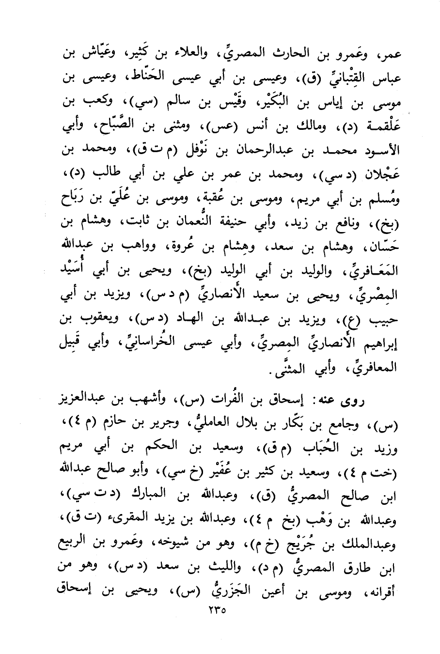 (بخ) ، ونافع بْن زيد، وأبي حنيفة النعمان بْن ثابت، وهشام بْن حسان، وهشام بْن سعد، وهشام بْن عروة، وواهب بْن عَبد اللَّهِ المعافري، والوليد بن أَبي الوليد (بخ) ، ويحيى بْن أَبي أسيد المِصْرِي، ويحيى بن سَعِيد الأَنْصارِيّ (م د س) ، ويزيد بْن أَبي حبيب (ع) ، ويزيد بن عَبد الله بْن الهاد (د س) ، ويعقوب بْن إبراهيم الأَنْصارِيّ المِصْرِي، وأبي عِيسَى الخراساني، وأبي قبيل المعافري، وأبي المثنى.