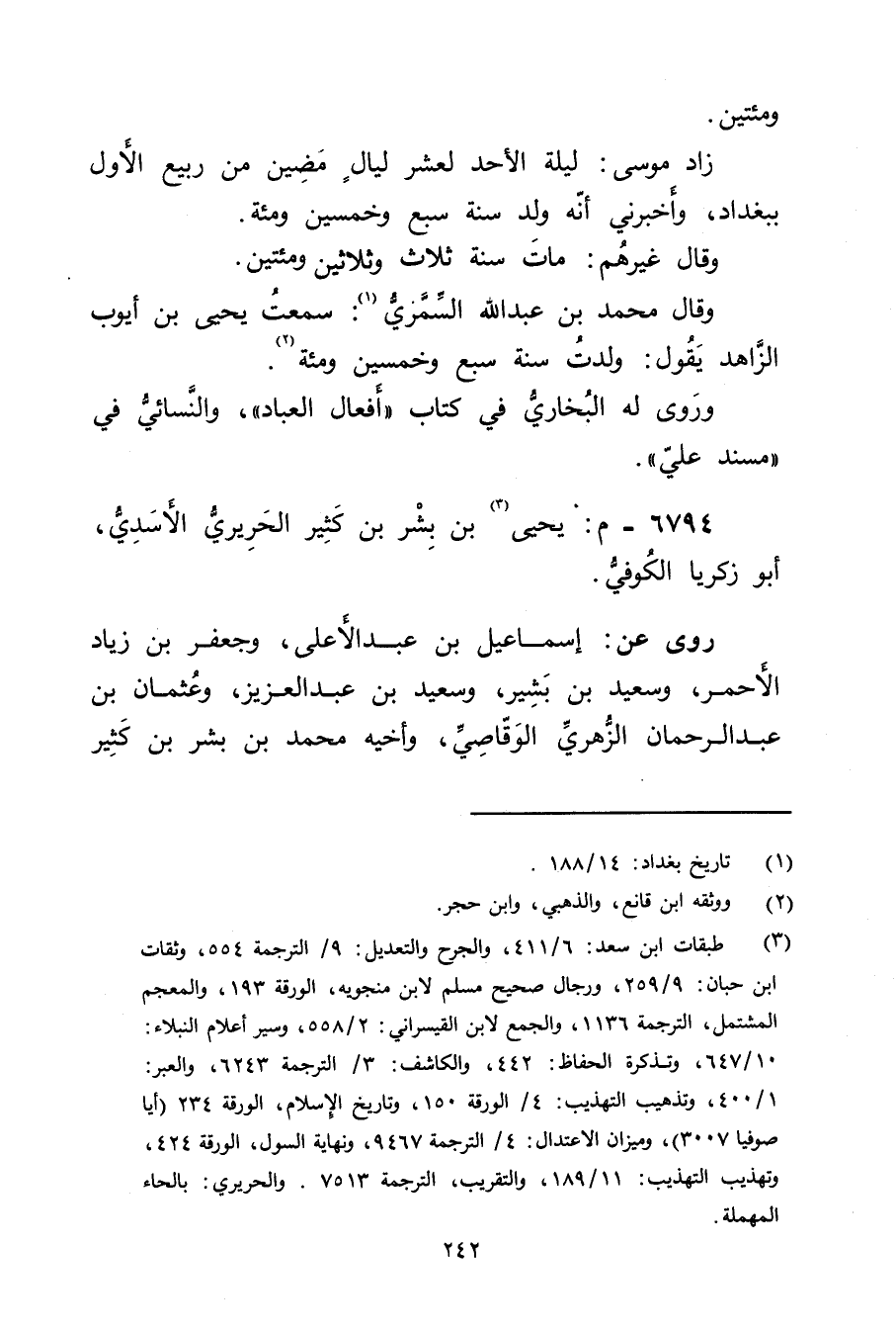 (3) طبقات ابن سعد: 6 / 411، والجرح والتعديل: 9 / الترجمة 554، وثقات ابن حبان: 9 / 259، ورجال صحيح مسلم لابن منجويه، الورقة 193، والمعجم المشتمل، الترجمة 1136، والجمع لابن القيسراني: 2 / 558، وسير أعلام النبلاء: 10 / 647، وتذكرة الحفاظ: 442، والكاشف: 3 / الترجمة 6243، والعبر: 1 / 400، وتذهيب التهذيب: 4 / الورقة 150، وتاريخ الاسلام، الورقة 234، (أيا صوفيا 3007) ، وميزان الاعتدال: 4 / الترجمة 9467، ونهاية السول، الورقة 424، وتهذيب التهذيب: 11 / 189، والتقريب، الترجمة 7513، والحريري: بالحاء المهملة