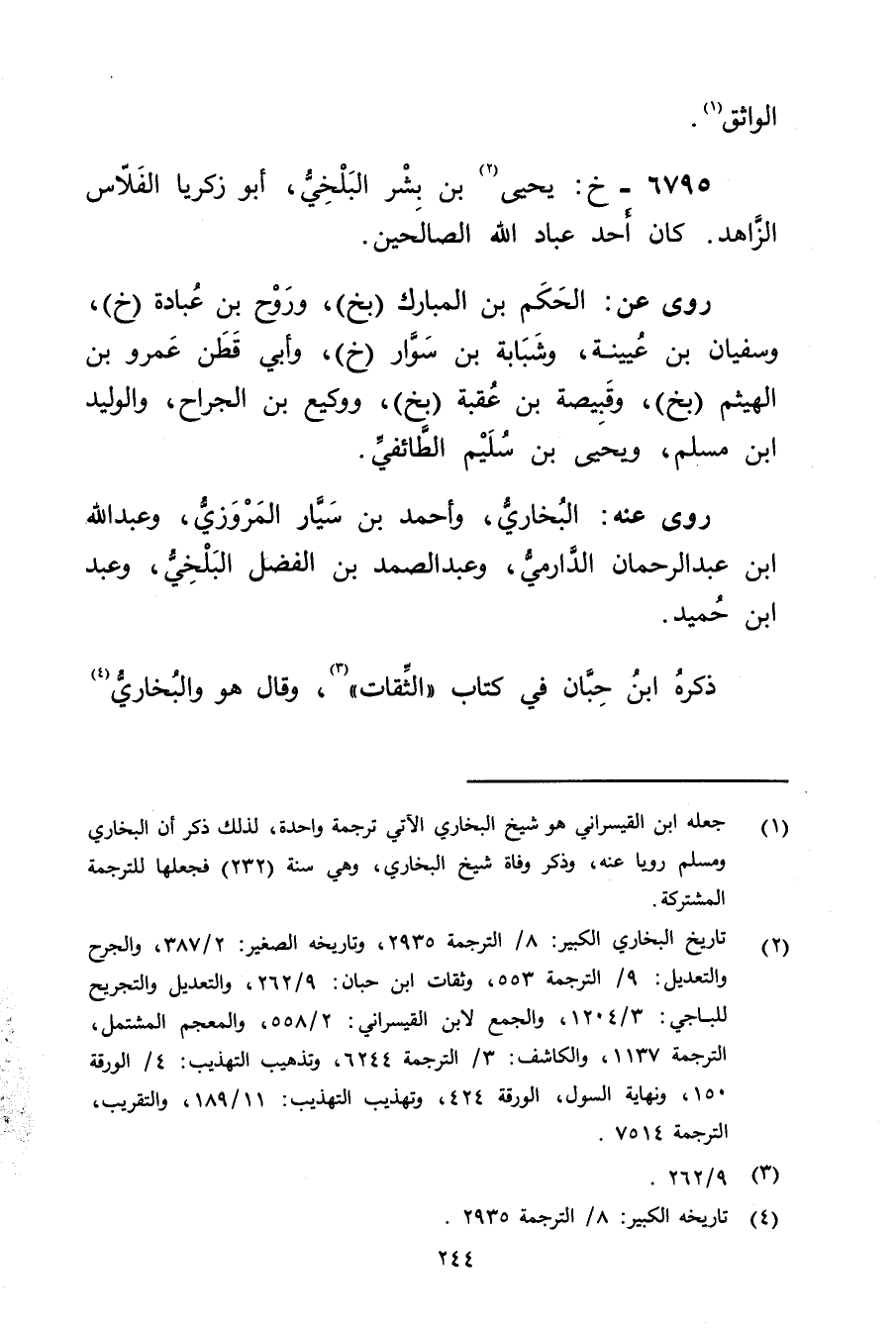 6795 - خ: يَحْيَى بن بِشْر البلخي (2) ، أَبُو زكريا الفلاس الزاهد. كَانَ أحد عباد الله الصالحين.