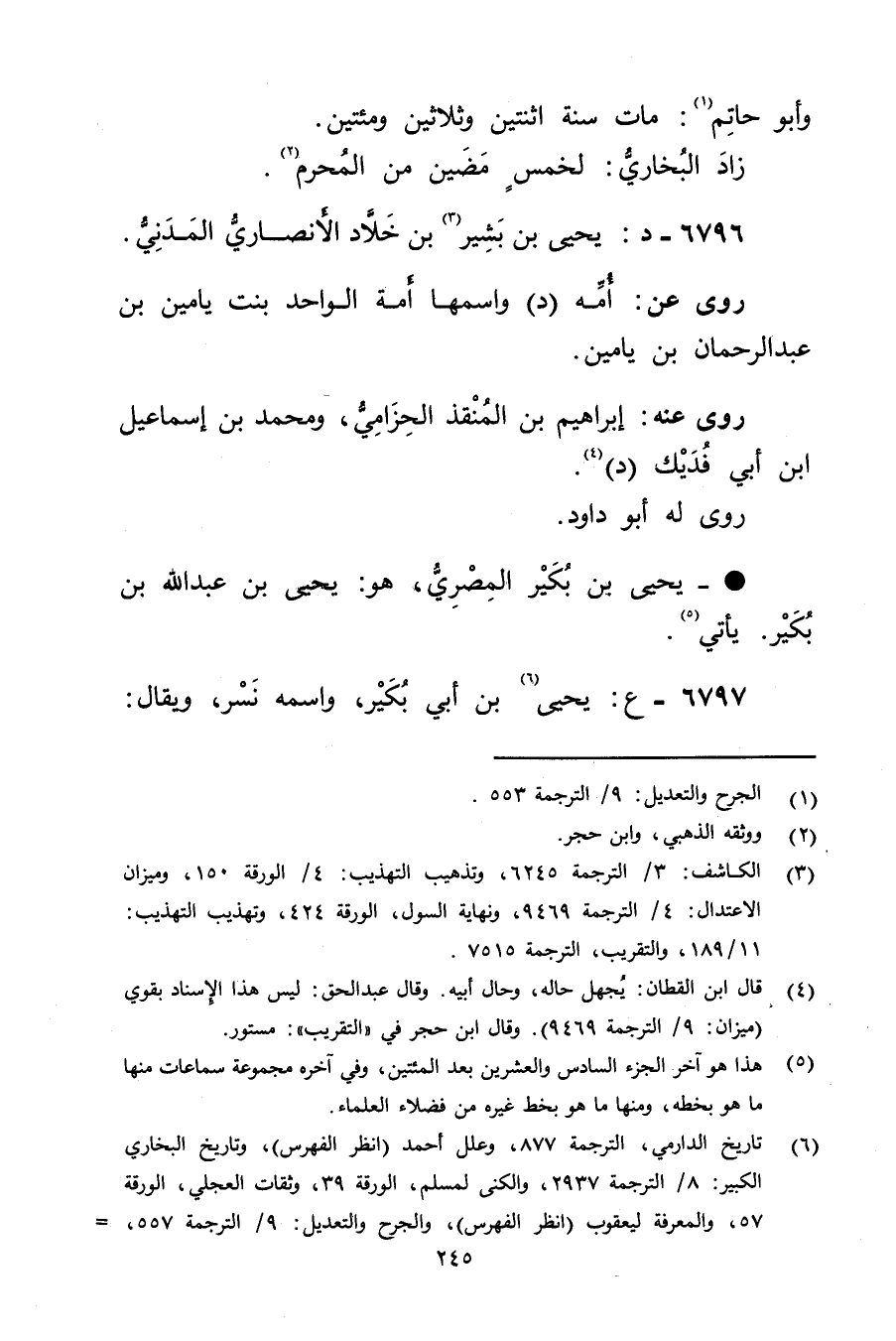 (6) تاريخ الدارمي، الترجمة 877، وعلل أحمد،، وتاريخ البخاري الكبير: 8 / الترجمة 2937، والكنى لمسلم، الورقة 39، وثقات العجلي، الورقة 57،، والجرح والتعديل: 9 / الترجمة 557، =