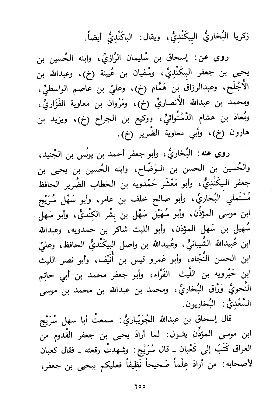 مستملي الْبُخَارِيّ، وأَبُو صَالِح خلف بْن عَامِر، وأَبُو سهل سريج ابن مُوسَى المؤذن، وأَبُو سهيل سهل بْن بِشْر الْكِنْدِيّ، وأَبُو سهل سهيل بْن سهل المؤذن، وأَبُو الليث شاكر بْن حمدويه، وعبد الله بْن عُبَيد اللَّهِ الشيباني، وعُبَيد الله بن واصل البيكندي الحافظ، وعلي ابن الْحَسَن النجاد، وأَبُو عَمْرو قيس بْن أنيف، وأَبُو نصر الليث ابن حبرويه بْن الليث الْفَرَّاء، وأَبُو جَعْفَر مُحَمَّد بْن أَبي حاتم النحوي وراق الْبُخَارِيّ، ومُحَمَّد بْن عَبد اللَّهِ بْن مُحَمَّد بْن مُوسَى السعدي: البخاريون.