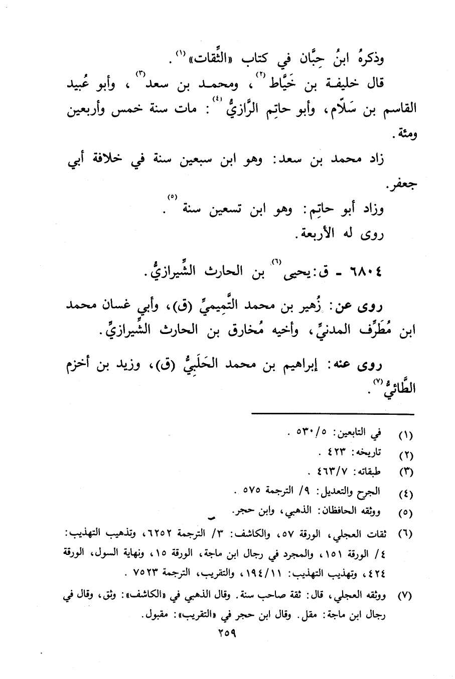 (6) ثقات العجلي، الورقة 57، والكاشف: 3 / الترجمة 6252، وتذهيب التهذيب: 4 / الورقة 151، والمجرد في رجال ابن ماجة، الورقة 15، ونهاية السول، الورقة 424، وتهذيب التهذيب: 11 / 194، والتقريب، الترجمة 7523، (7) ووثقه العجلي، قال: ثقة صاحب سنة. وَقَال الذهبي في " الكاشف": وثق، وَقَال في رجال ابن ماجة: مقل. وَقَال ابن حجر في "التقريب": مقبول