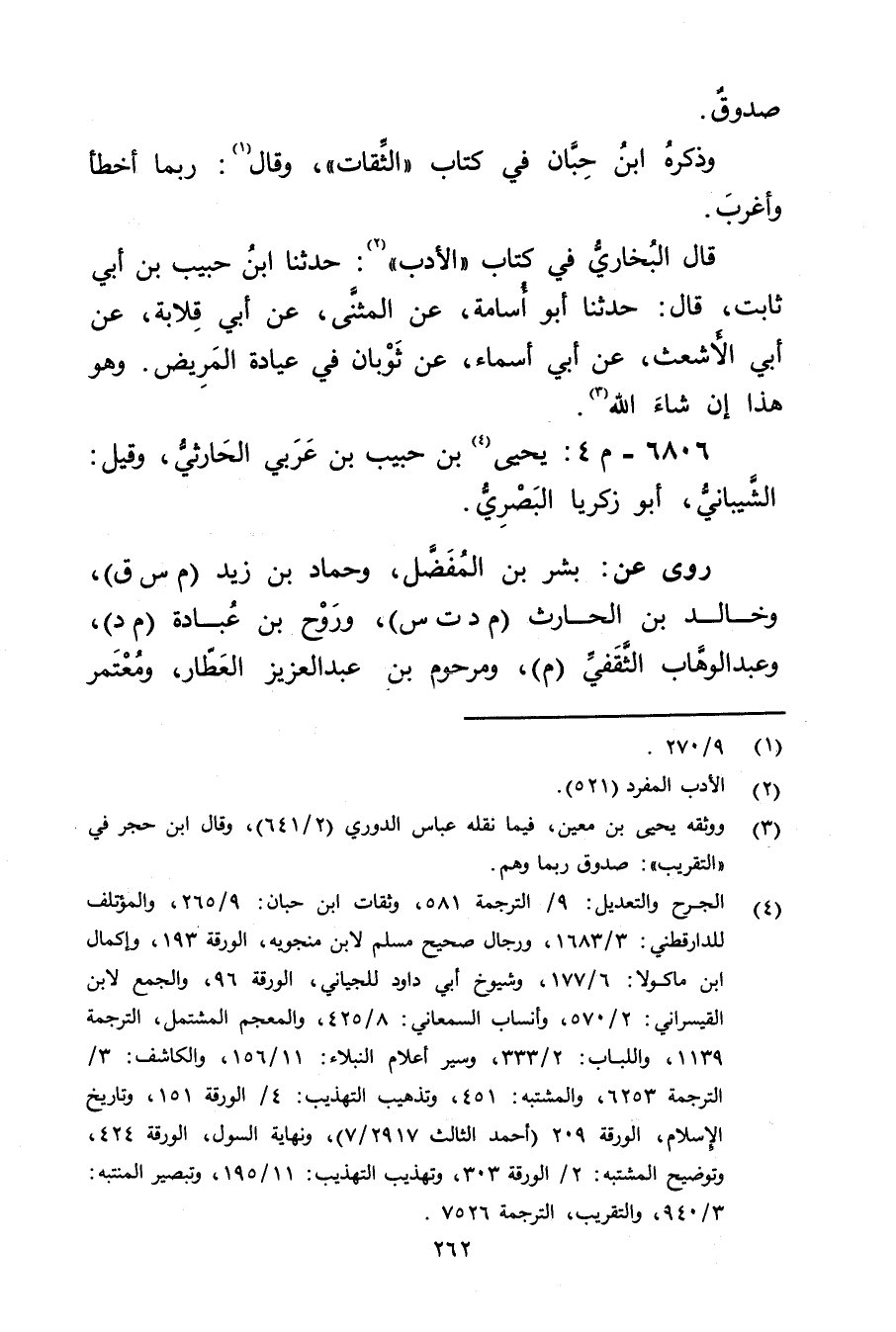 6806 - م 4: يَحْيَى بن حَبِيب بن عربي الحارثي (4) ، وقيل: الشيباني، أَبُو زكريا البَصْرِيّ.