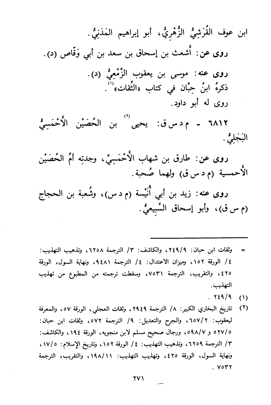(2) تاريخ البخاري الكبير: 8 / الترجمة 2949، وثقات العجلي، الورقة 57، والمعرفة ليعقوب: 2 / 657، والجرح والتعديل: 9 / الترجمة 572، وثقات ابن حبان 5 / 527 و7 / 598، ورجال صحيح مسلم لابن منجويه، الورقة 194، والكاشف: 3 / الترجمة 6259، وتذهيب التهذيب: 4 / الورقة 152، وتاريخ الاسلام: 5 / 17، ونهاية السول، الورقة 425، وتهذيب التهذيب: 11 / 198، والتقريب، الترجمة 7532