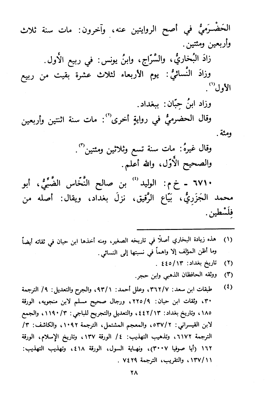 (4) طبقات ابن سعد: 7 / 362، وعلل أحمد 1 / 93، والجرح والتعديل: 9 / الترجمة 30، وثقات ابن حبان: 9 / 225، ورجال صحيح مسلم لابن منجويه، الورقة 185، وتاريخ بغداد: 13 / 442، والتعديل والتجريح للباجي: 3 / 1190، والجمع لابن القيسراني: 2 / 537، والمعجم المشتمل، الترجمة 1092، والكاشف: 3 / الترجمة 6172، وتذهيب التهذيب: 4 / الورقة 137، وتاريخ الاسلام، الورقة 162 (أيا صوفيا 3007) ، ونهاية السول، الورقة 418، وتهذيب التهذيب: 11 / 137، والتقريب، الترجمة 7429
