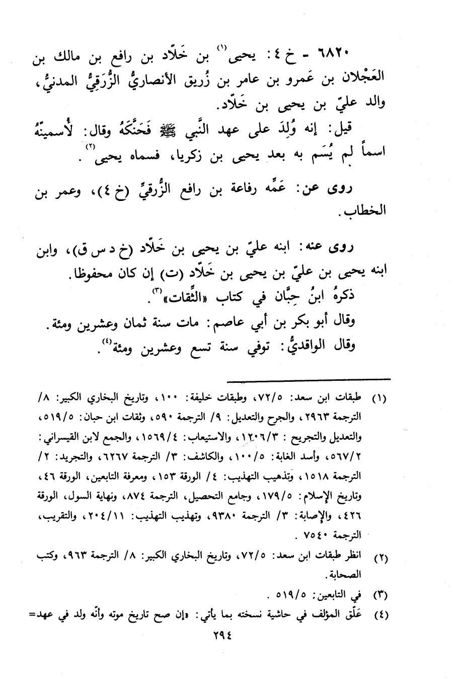 6820 - خ 4: يَحْيَى بن خلاد بن رافع بن مالك بن العجلان بْن عَمْرو بْن عامر بْن زريق الأَنْصارِيّ الزرقي المدني (1) ، والد علي بْن يَحْيَى بْن خلاد.
