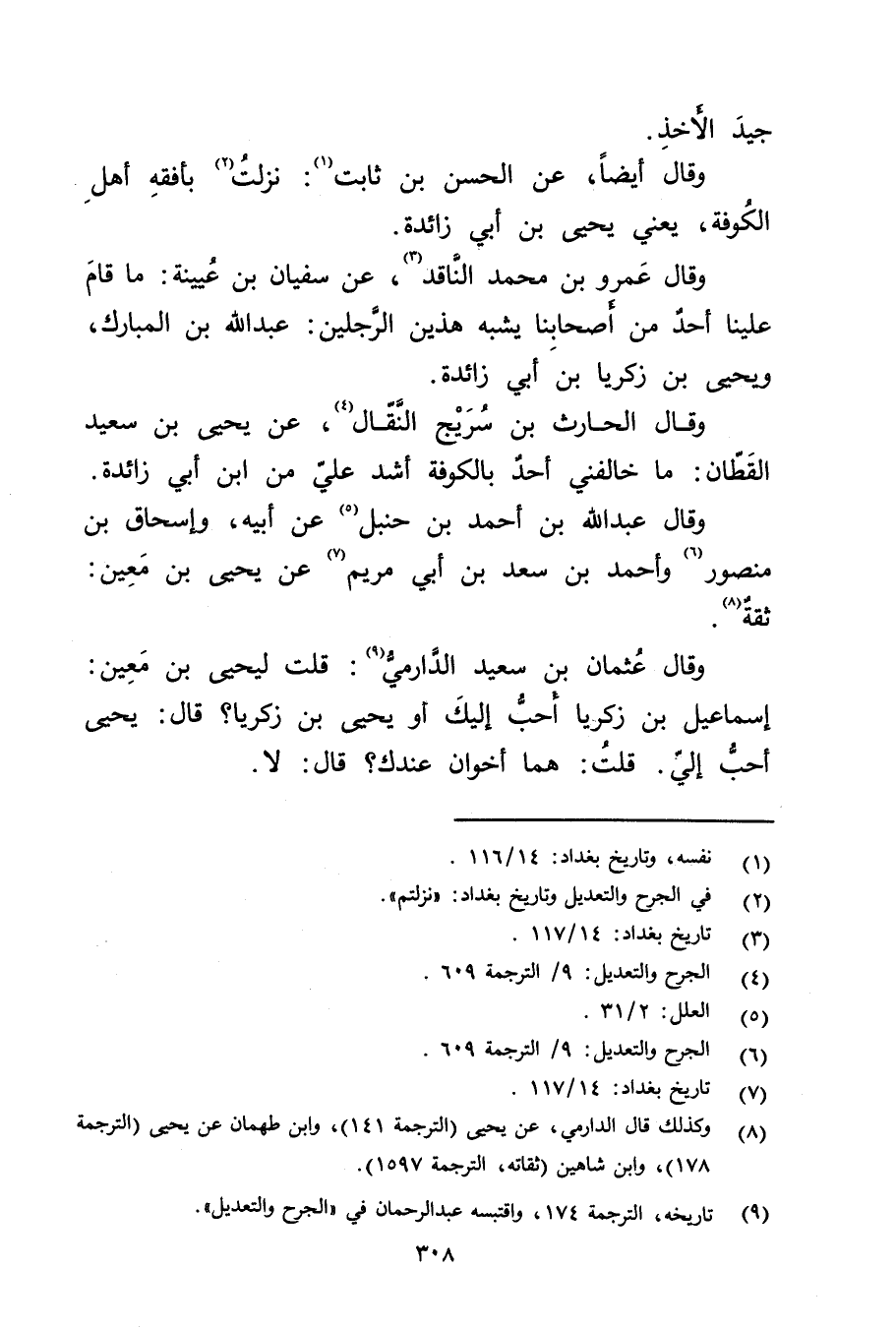 (8) وكذلك قال الدارمي، عن يحيى (الترجمة 141) ، وابن طهمان عن يحيى (الترجمة 178، وابن شاهين (ثقاته، الترجمة 1597) .