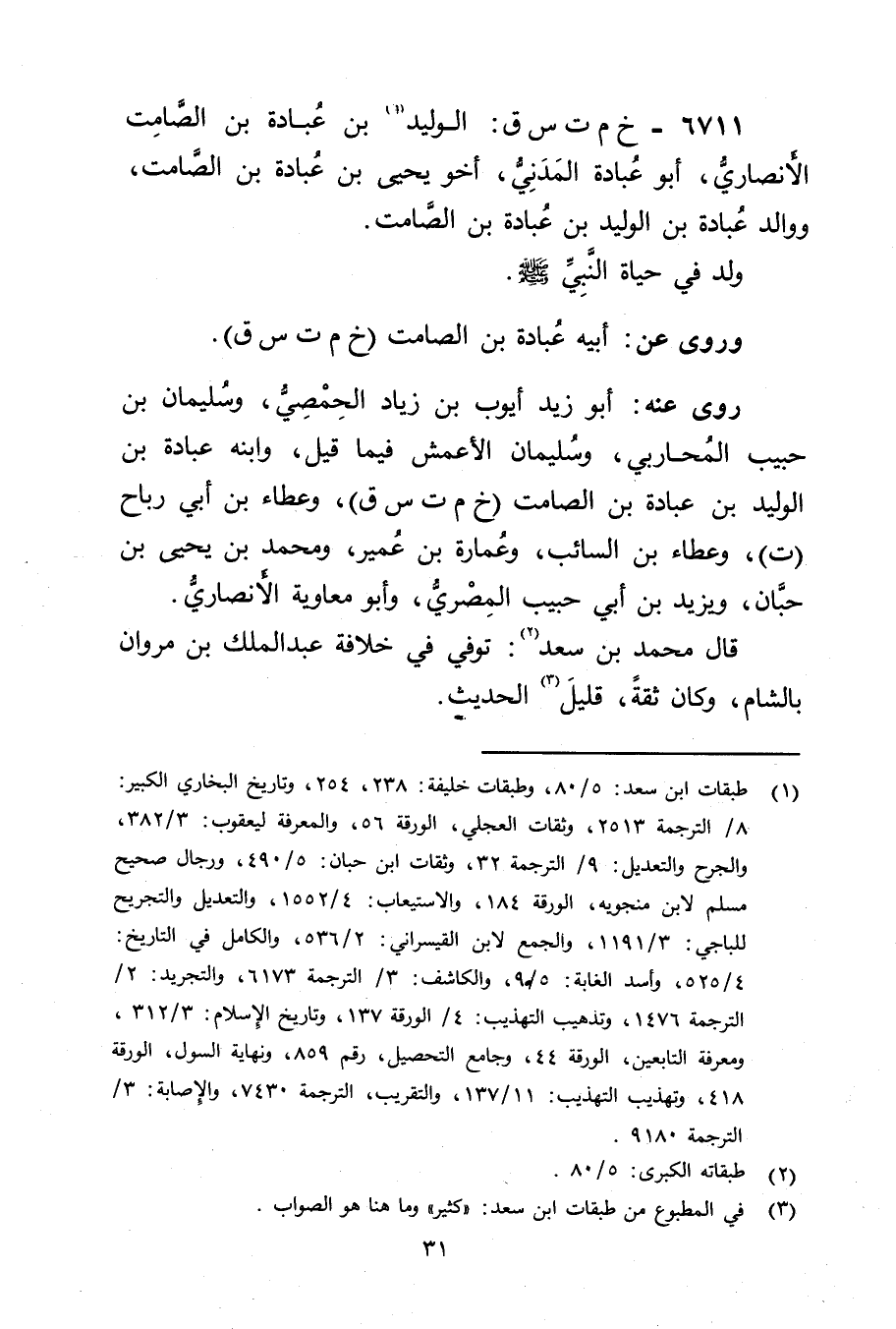 6711 - خ م ت س ق: الوليد بن عبادة بن الصامت الأَنْصارِيّ (1) ، أَبُو عبادة المدني، أخو يَحْيَى بْن عبادة بْن الصامت، ووالد عبادة بْن الْوَلِيد بْن عبادة بن الصامت.