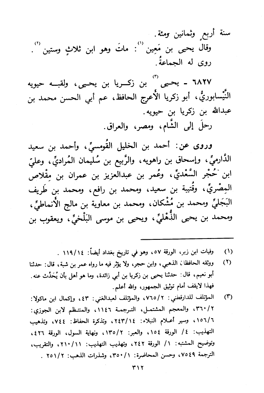 6827 - يَحْيَى بن زكريا بن يَحْيَى (3) ، ولقبه حيويه النيسابوري، أَبُو زكريا الأعرج الْحَافِظ، عم أَبِي الْحَسَن مُحَمَّد بْن عَبد اللَّهِ بْن زكريا بْن حيويه.