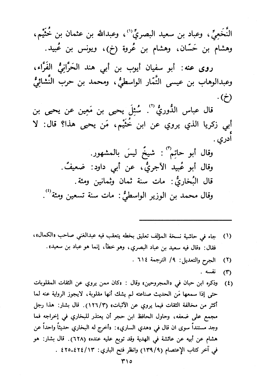 (4) وذكره ابنُ حِبَّان في " المجروحين" وَقَال: كان ممن يروي عن الثقات المقلوبات حتى إذا سمعها من الحديث صناعته لم يشك أنها مقلوبة، لا يجوز الرواية عنه لما أكثر من مخالفة الثقات فيما يروي عن الاثبات" (3 / 126) قال بشار: هذا رجل مجمع على ضعفه، وحاول الحافظ ابن حجر أن يعتذر للبخاري في إخراجه فما وجد مستندا سوى ان قال في " هدي الساري": أخرج له البخاري حديثا واحدا عن هشام عَن أبيه عن عائشة في الهدية وقد توبع عليه عنده" (628) . قال بشار: هو في آخر كتاب الاعتصام (9 / 139) وانظر فتح الباري" 13 / 424 - 425