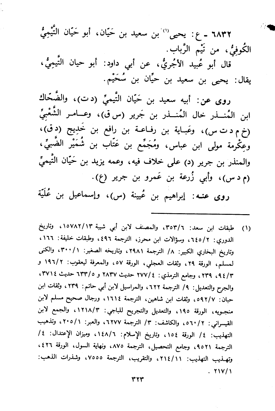 6832 - ع: يَحْيَى بن سَعِيد بن حيان (1) ، أَبُو حيان التَّيْمِيّ. الكوفي، من تيم الرباب.