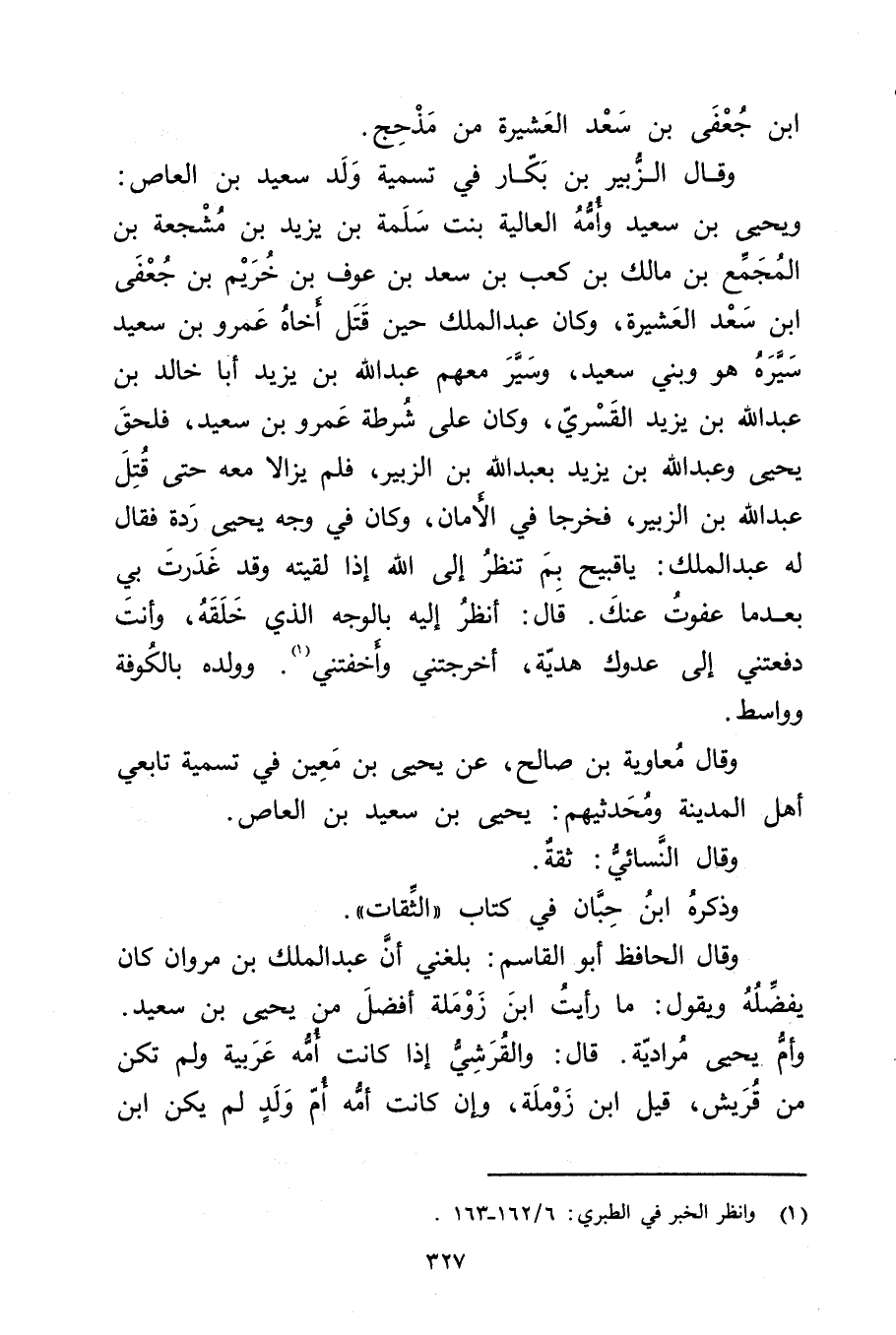 وَقَال معاوية بْن صَالِح، عن يَحْيَى بْن مَعِين فِي تسمية تابعي أهل المدينة ومحدثيهم: يَحْيَى بْن سَعِيد بْن العاص.
