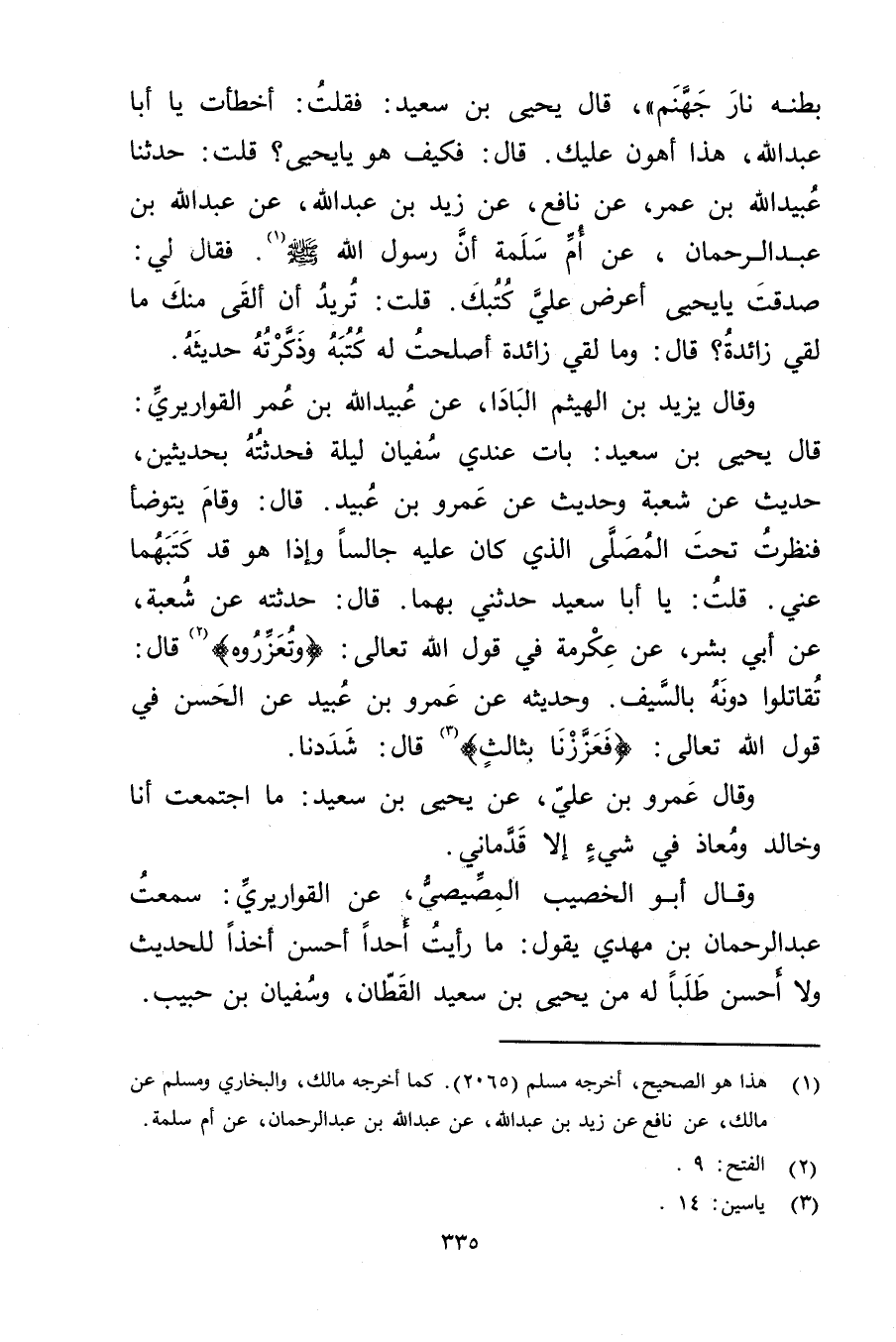 وَقَال يَزِيد بْن الْهَيْثَم البادا، عَنْ عُبَيد اللَّهِ بْن عُمَر القواريري: قال يَحْيَى بْن سَعِيد: بات عندي سُفْيَان ليلة فحدثته بحديثين، حديث عَنْ شُعْبَة وحديث عَنْ عَمْرو بْن عُبَيد. قال: وقام يتوضأ فنظرت تحت المصلى الذي كَانَ عليه جالسا وإذا هُوَ قد كتبهما عني. قلت: يا أَبَا سَعِيد حَدَّثَنِي بهما. قال: حدثته عَنْ شُعْبَةُ. عَن أَبِي بِشْرٍ، عَنْ عكرمة فِي قول الله تعالى: (وتعزروه) (2) قال: تقاتلوا دونه بالسيف. وحديثه عَنْ عَمْرو بْن عُبَيد عَنِ الْحَسَن فِي قول الله تعالى: (فعززنا بثالث) (3) قال: شددنا.