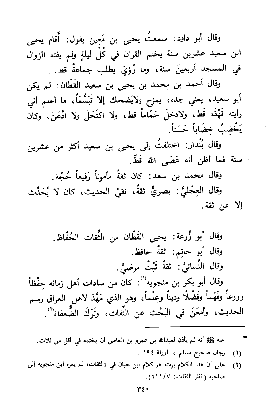وَقَال أبو داود: سمعت يحيى بْن مَعِين يَقُول: أقام يَحْيَى ابن سَعِيد عشرين سنة يختم القرآن فِي كل ليلة ولم يفته الزوال فِي المسجد أربعين سنة، وما رؤي يطلب جماعة قط.