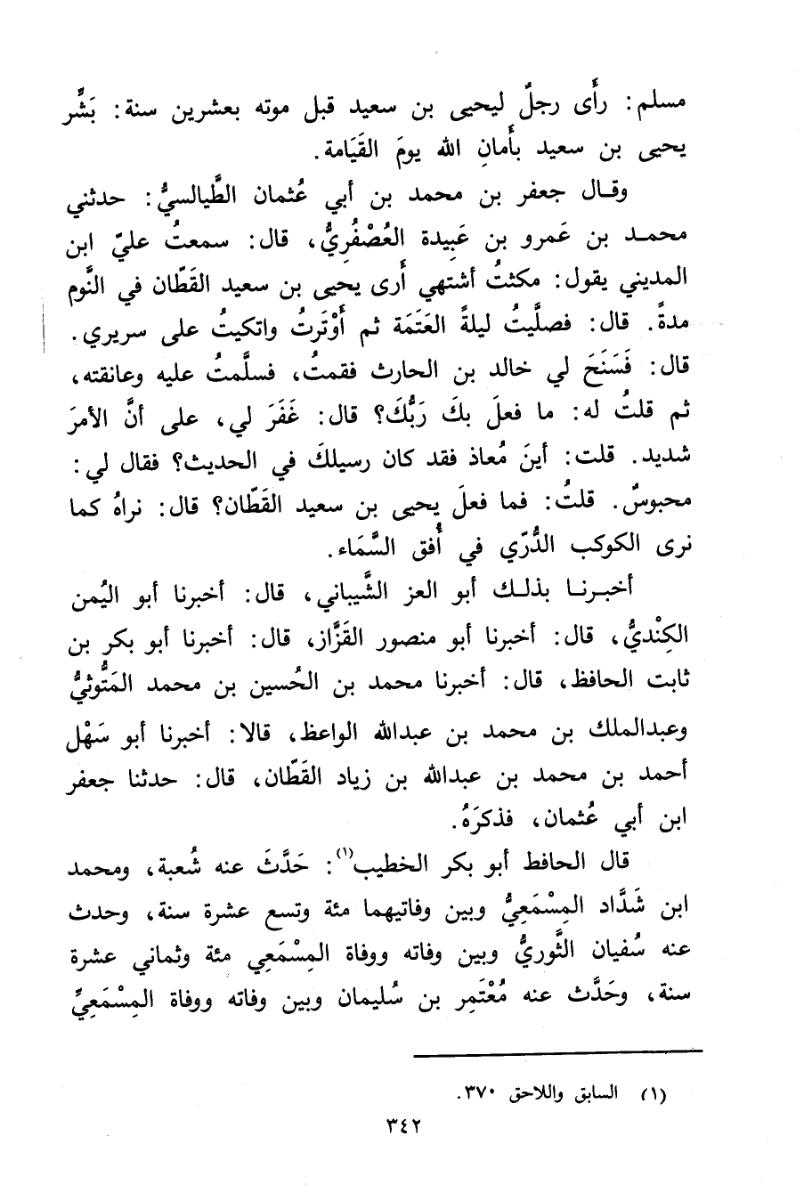 قال: فصليت ليلة العتمة ثُمَّ أوترت واتكيت على سريري. قال: فسنح لي خَالِد بْن الْحَارِث فقمت، فسلمت عليه وعانقته، ثُمَّ قلت له: مَا فعل بك ربك؟ قال: غفر لي، على أن الأمر شديد. قلت: أين مُعَاذ فقد كَانَ رسيلك فِي الحديث؟ فَقَالَ لي: محبوس قلت: فما فعل يَحْيَى بْن سَعِيد القطان؟ قال: نراه كما نرى الكوكب الدري فِي أفق السماء.