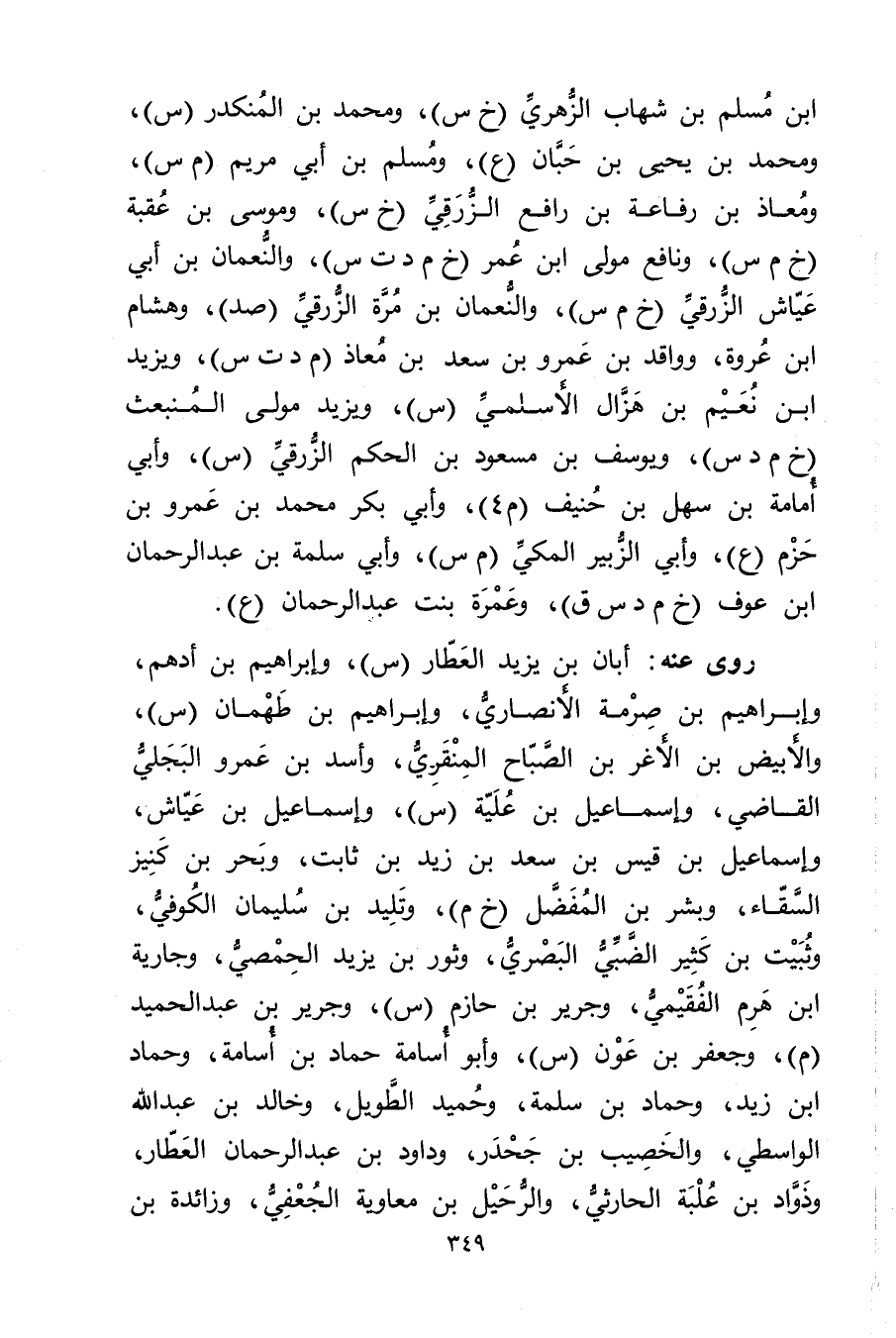 ابن مسلم بْن شهاب الزُّهْرِيّ (خ س) ، ومحمد بْن المنكدر (س) ، ومُحمد بْن يَحيى بْن حَبَّان (ع) ، ومسلم بْن أَبي مَرْيَم (م س) ، ومعاذ بْن رفاعة بْن رافع الزرقي (خ س) ، وموسى بْن عقبة (خ م س) ، ونافع مولى ابْن عُمَر (خ م د ت س) ، والنعمان بْن أَبي عياش الزرقي (خ م س) ، والنعمان بْن مرة الزرقي (صد) ، وهشام ابن عروة، وواقد بْن عَمْرو بْن سَعْد بْن مُعَاذ (م د ت س) ، ويزيد ابن نعيم بن هزال الأَسلميّ (س) ، ويزيد مولى المنبعث (خ م د س) ، ويوسف بْن مَسْعُود بْن الحكم الزرقي (س) ، وأبي أمامة بْن سهل بْن حنيف (م 4) ، وأبي بَكْر مُحَمَّد بْن عَمْرو بْن حَزْم (ع) ، وأبي الزبير المكي (م س) ، وأبي سَلَمَة بن عبد الرحمن ابن عوف (خ م د س ق) ، وعُمَرة بنت عَبْد الرحمن (ع) رَوَى عَنه: أبان بن يَزِيدَ العطار (س) ، وإِبْرَاهِيم بْن أدهم، وإبراهيم بْن صرمة الأَنْصارِيّ، وإبراهيم بْن طهمان (س) ، والأبيض بْن الأَغَر بْن الصباح المنقري، وأسد بْن عَمْرو البجلي القاضي، وإسماعيل بن علية (س) ، وإِسْمَاعِيل بْن عَيَّاش، وإسماعيل بْن قيس بْن سعد بْن زيد بْن ثابت، وبحر بْن كنيز السقاء، وبشر بْن المفضل (خ م) ، وتليد بْن سُلَيْمان الكوفي وثبيت بْن كَثِير الضبي البَصْرِيّ، وثور بْن يَزِيد الحمصي، وجارية ابن هرم الفقيمي، وجرير بْن حازم (س) ، وجرير بن عبد الحميد (م) ، وجعفر بْن عون (س) ، وأبو أسامة حامد بن أسامة، وحماد ابن زيد، وحماد بْن سلمة، وحميد الطويل، وخالد بْن عَبد اللَّهِ الْوَاسِطِيّ، والخصيب بْن جحدر، وداود بْن عَبْد الرَّحْمَنِ العطار، وذواد بْن علبة الحارثي، والرحيل بْن معاوية الجعفي، وزائدة بْن
