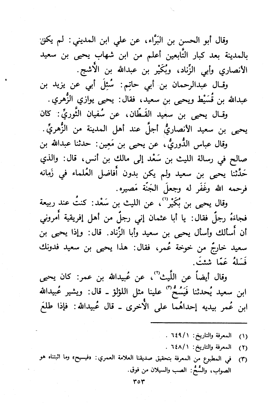 وَقَال عَباس الدُّورِيُّ، عن يحيى بْن مَعِين: حَدَّثَنَا عَبد اللَّهِ بْن صَالِح فِي رسالة الليث بن سعد إِلَى مَالِك بْن أَنَس، قال: والذي حَدَّثَنَا يَحْيَى بْن سَعِيد ولم يكن بدون أفاضل العلماء فِي زمانه فرحمه الله وغفر له وجعل الجنة مصيره.